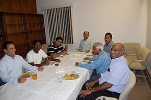 Priests share an Indian meal at Holy Apostles Parish, New Berlin, Thursday, Sept. 24. From left, Pallottine Fr. Steve Varghese; Fr. Gideon Buya; Frs. Thomas Vathappallil and Dominic Thomas, Missionaries of the Congregation of the Blessed Sacrament; Pallottine Fr. Davies Edassery; Fr. Thomas Kulliyanical; and Fr. Loyola Amalraj. All but Fr. Buya are natives of India; he is a native of Kenya. (Catholic Herald photo by Fr. Pat Heppe) One-by-one the mothers, beaten down by poverty in a country ironically known as a land of milk and honey, begged for money to feed the infants.