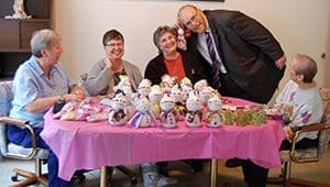 Sisters of Charity of St. Joan Antida enjoy a visit from St. Joan Antida High School head of school Paul Gessner on Oct. 26 as they make snowmen that will be sold at the school’s fundraiser, “Spaghetti with the Sisters,” this Sunday. Pictured are Srs. Marie Grohall, left to right, Elizabeth Weber, Mary Ann Cera and Marie Louise Balistrieri. (Catholic Herald photo by Ricardo Torres)school.