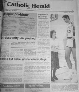 The front page of the Oct. 16, 1986 Catholic Herald includes the photo of Maryangela Layman talking with Bucks center Randy Breuer, taken by James Pearson, during media day at the Cousins Center.