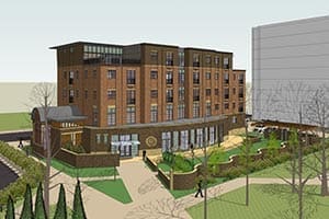 The new five-story building, designed by Kubala Washatko Architects, will have 25 resident rooms and five guest rooms. It will also feature a chapel with an entrance on the sidewalk – as opposed to being in the center of the building – to allow outside individuals to use it.