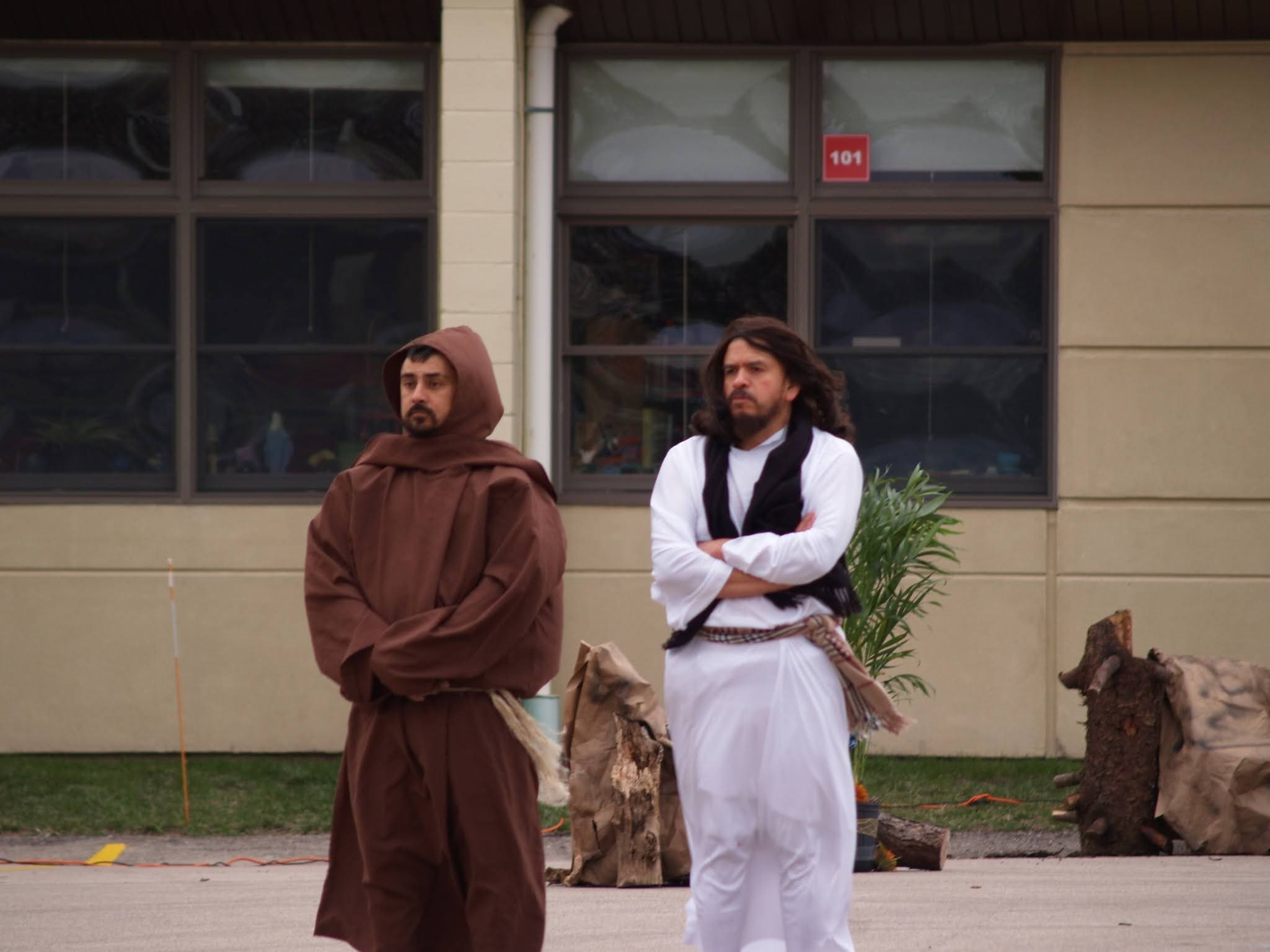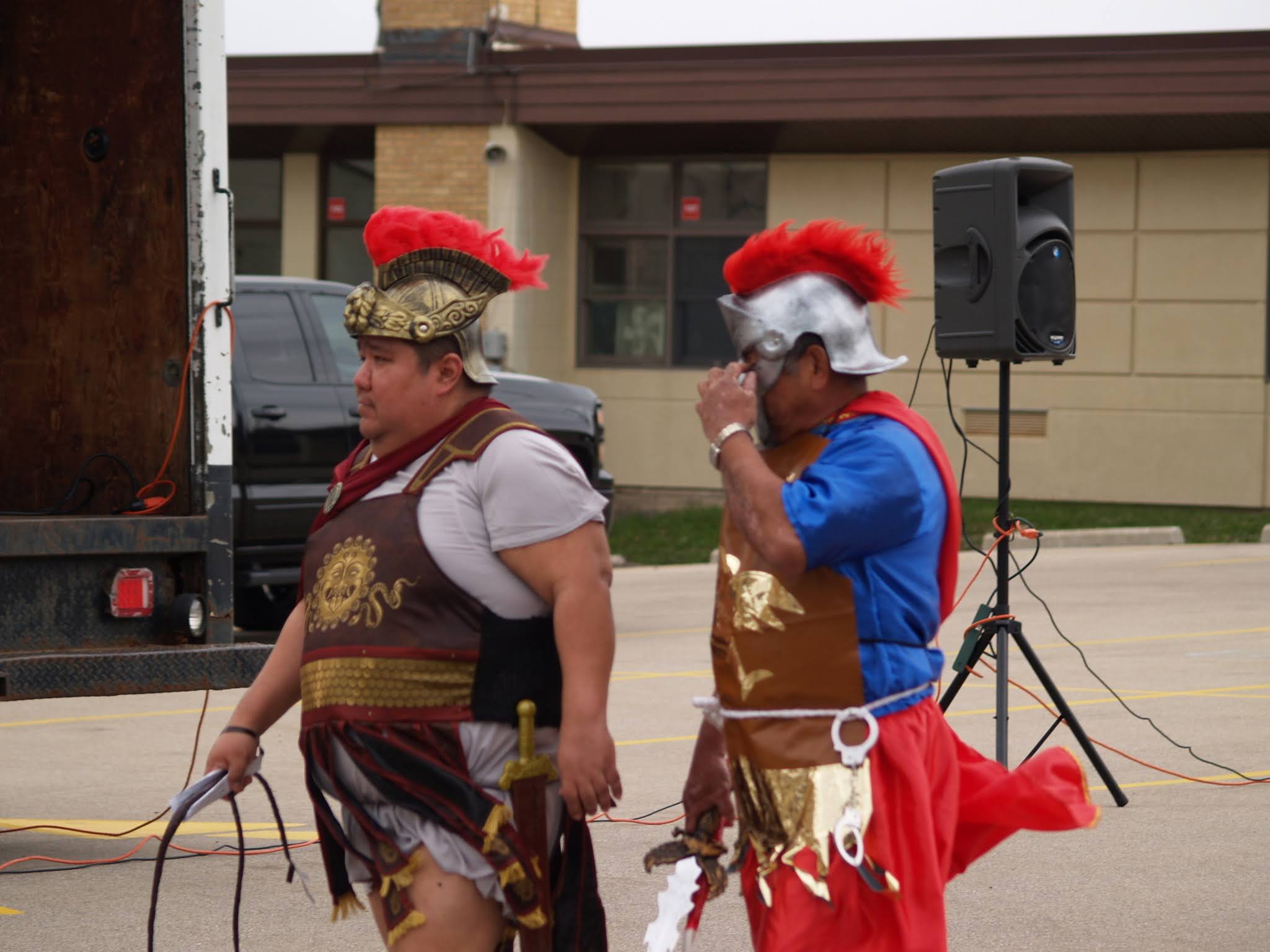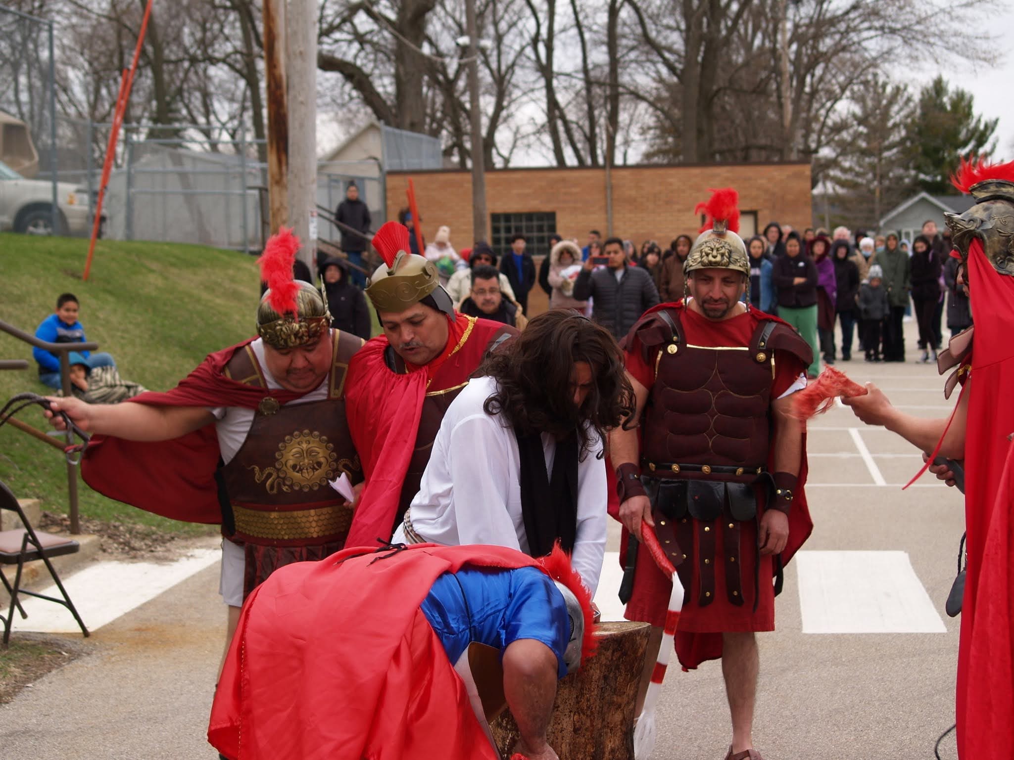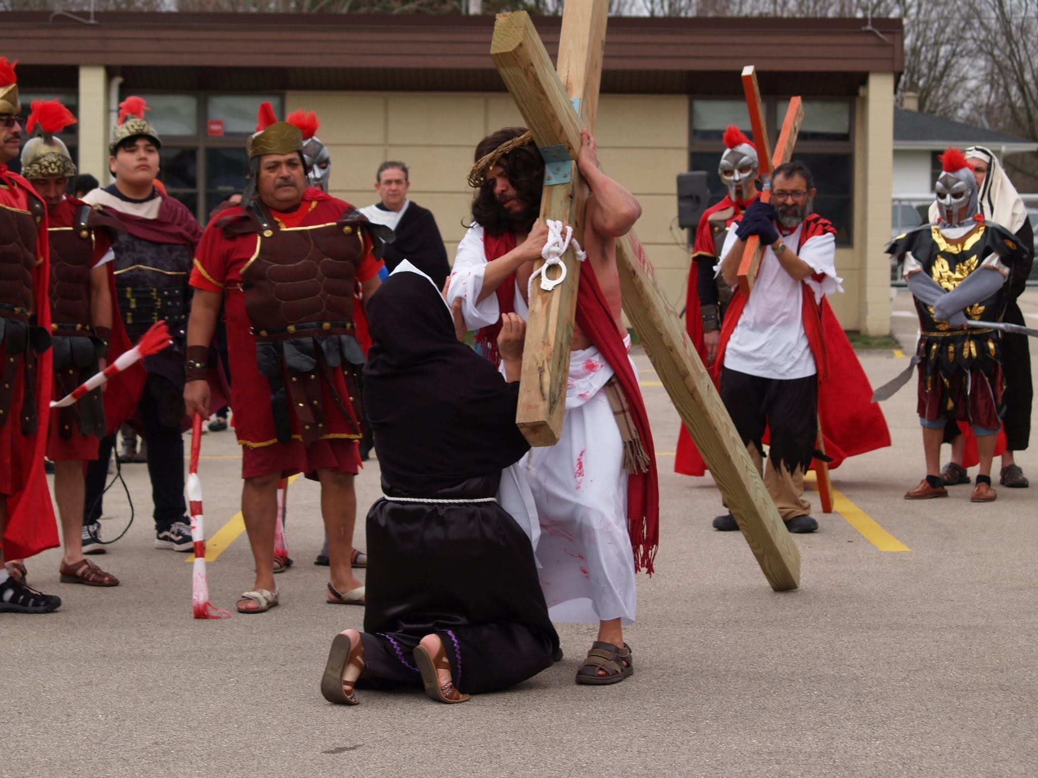 The reenactment drew around 100 faithful to follow Jesus from his condemnation by Pilate to his scourging and eventual crucifixion. The Stations began on one side of the parking lot, where Hispanic volunteers recreated the scene of Jesus being condemned to death. The prayers were said in Spanish, but the message hit home to the English-speaking attendees as well.