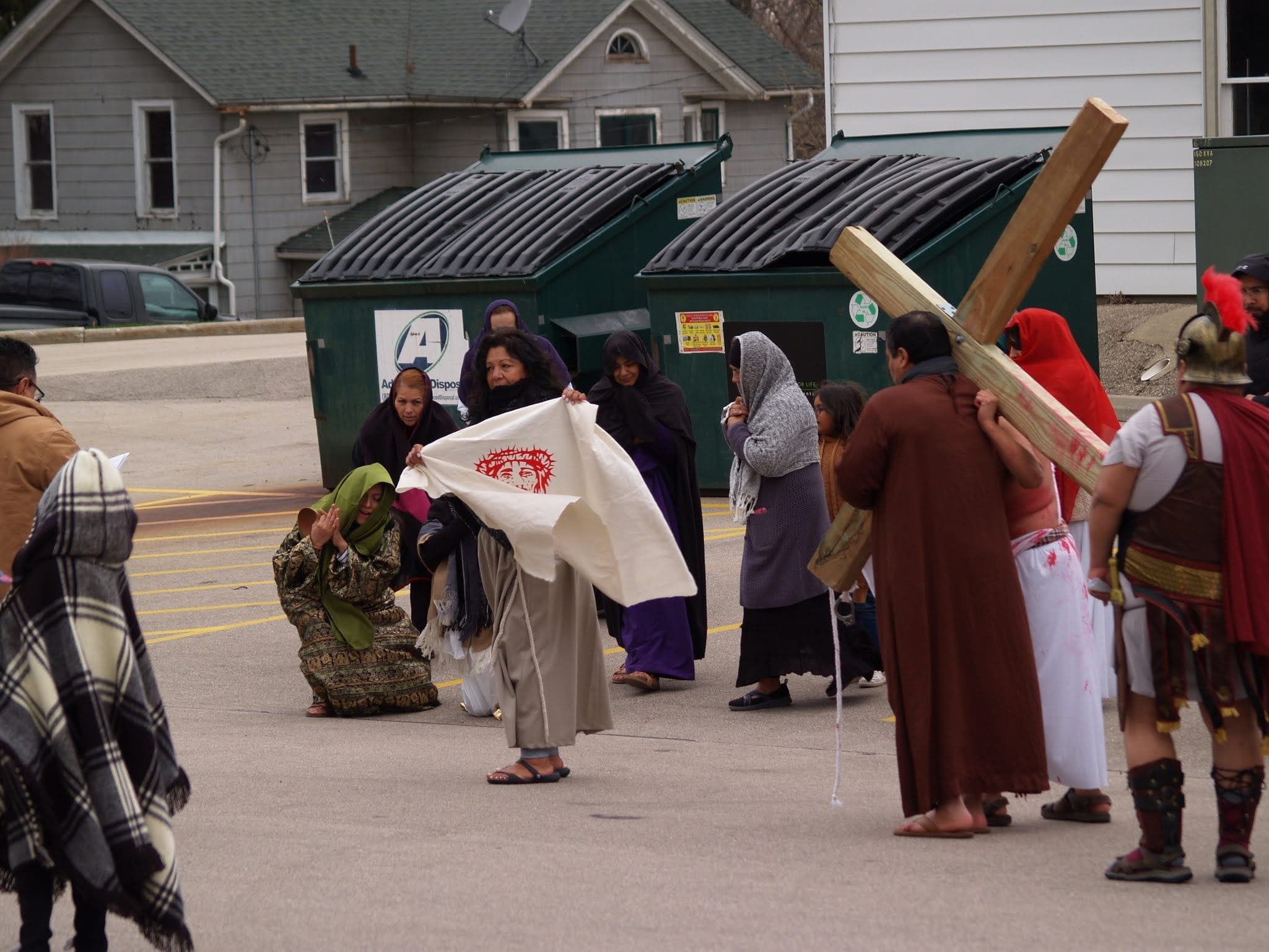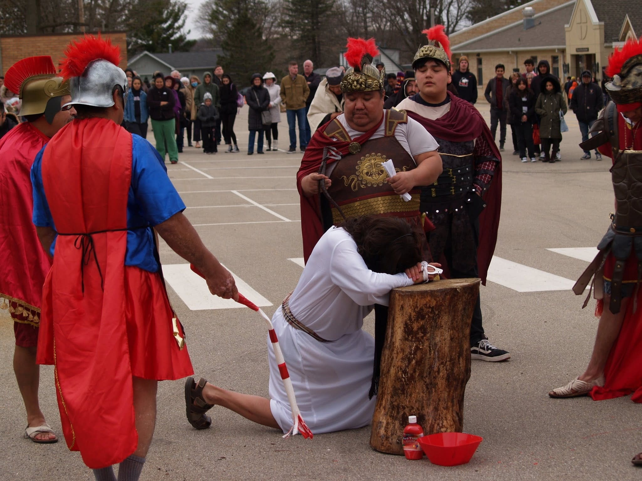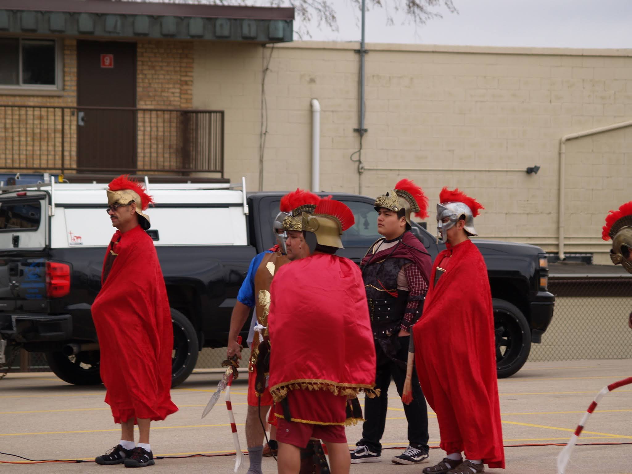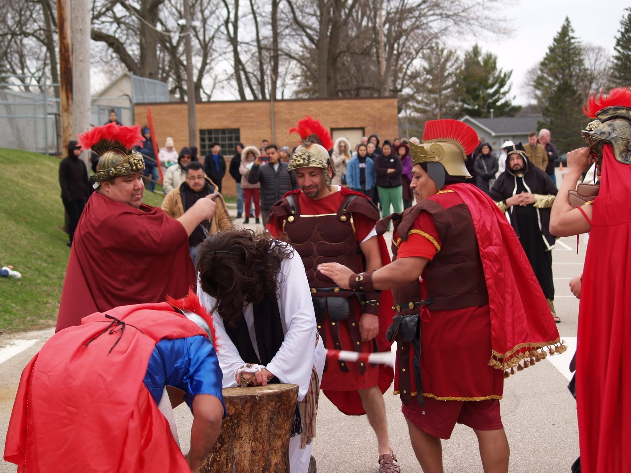 The reenactment drew around 100 faithful to follow Jesus from his condemnation by Pilate to his scourging and eventual crucifixion. The Stations began on one side of the parking lot, where Hispanic volunteers recreated the scene of Jesus being condemned to death. The prayers were said in Spanish, but the message hit home to the English-speaking attendees as well.
