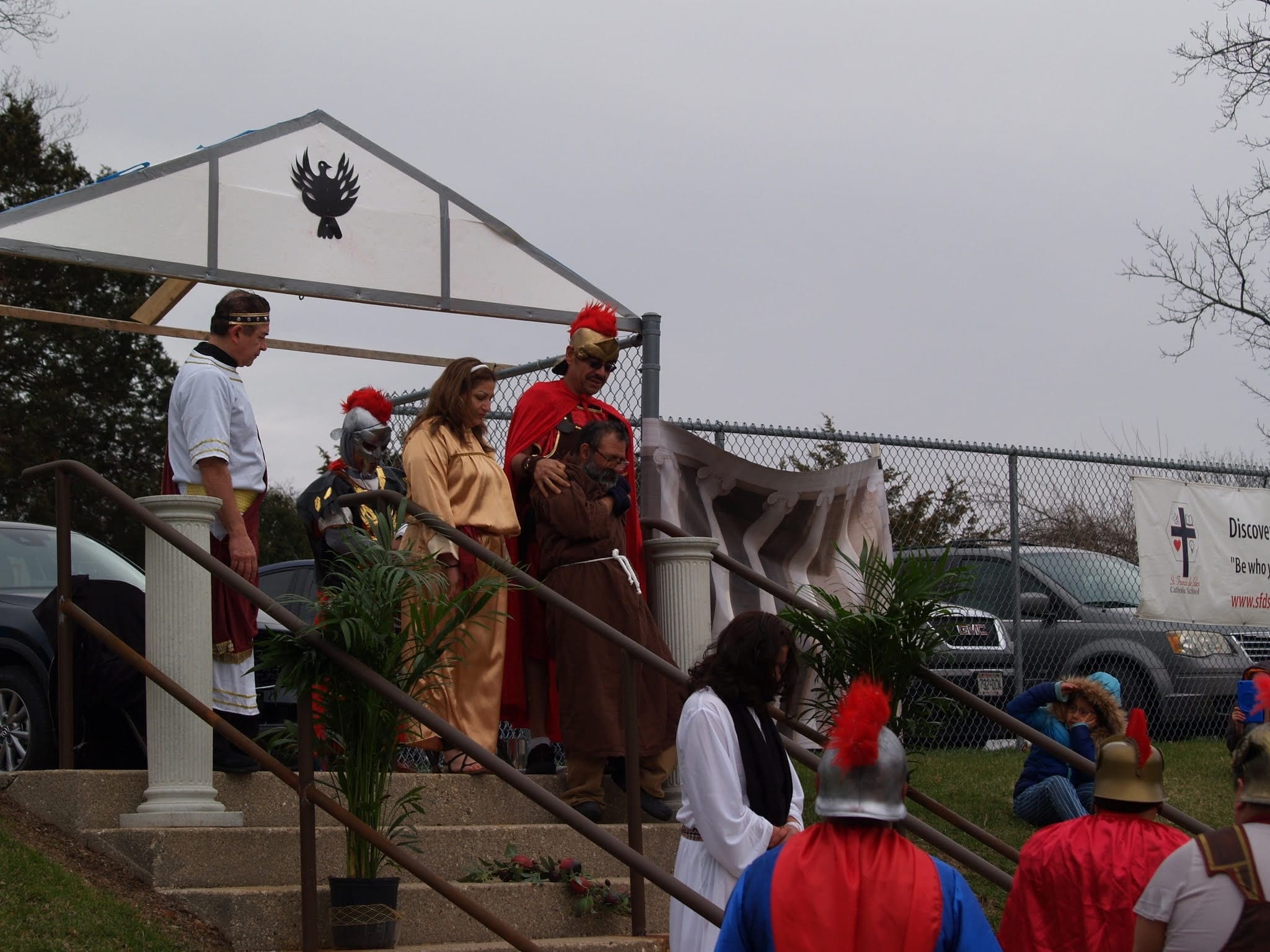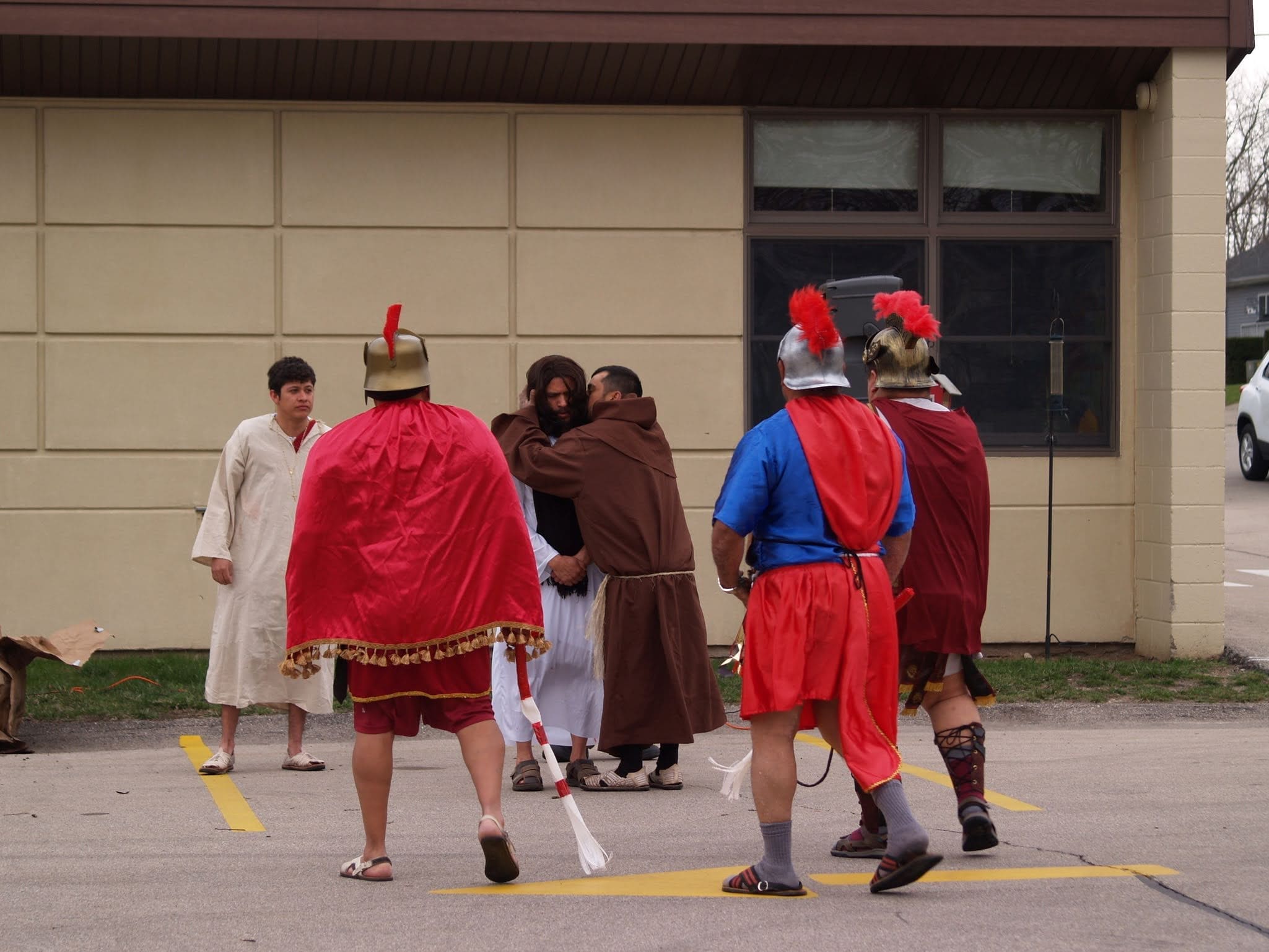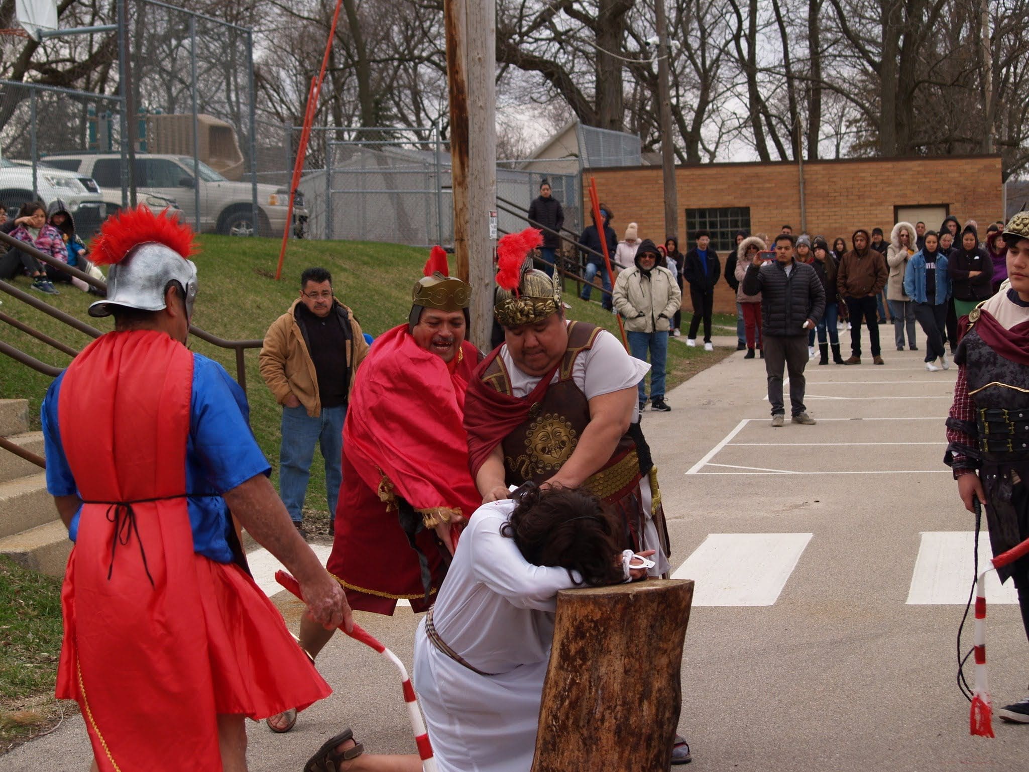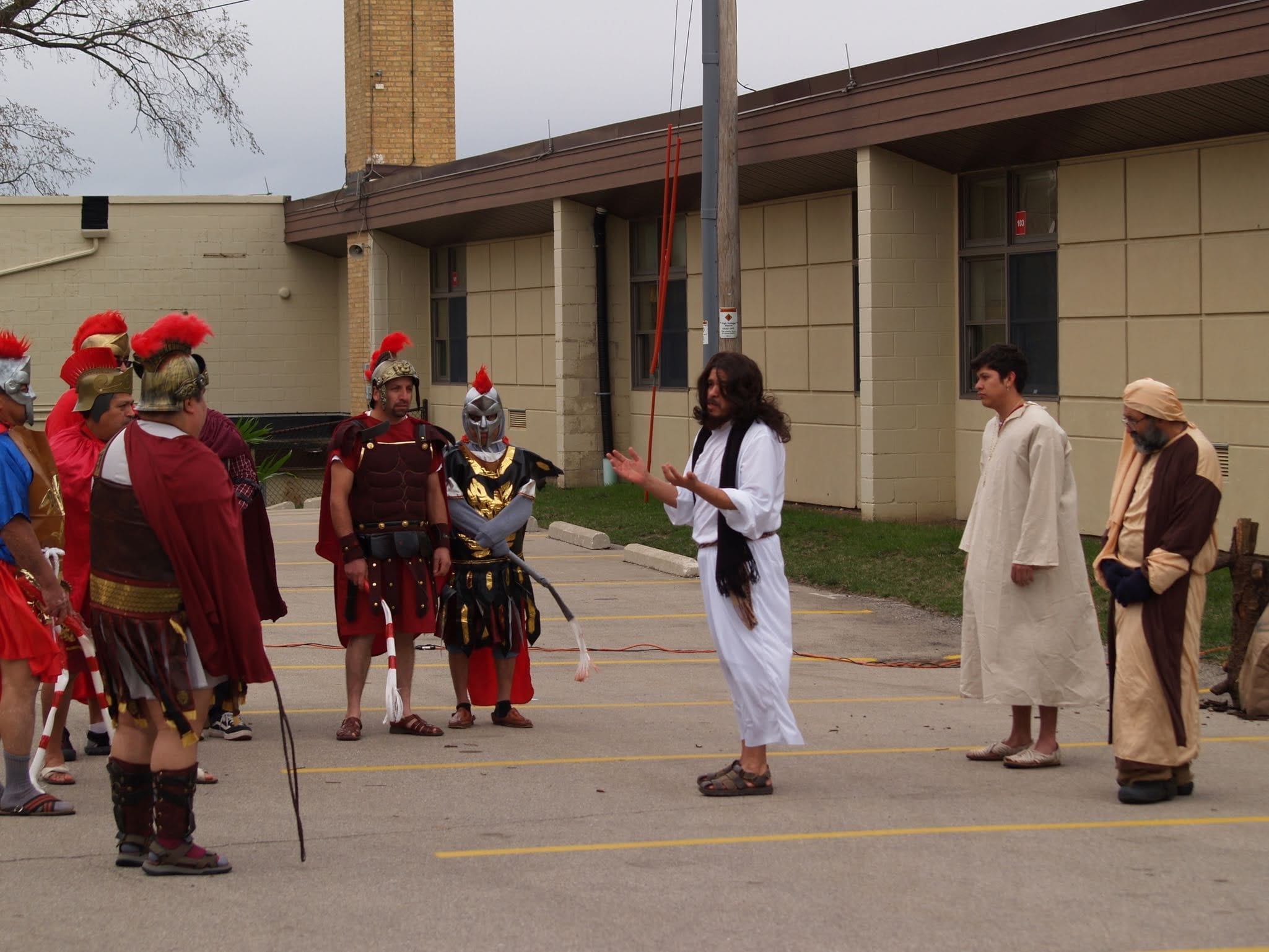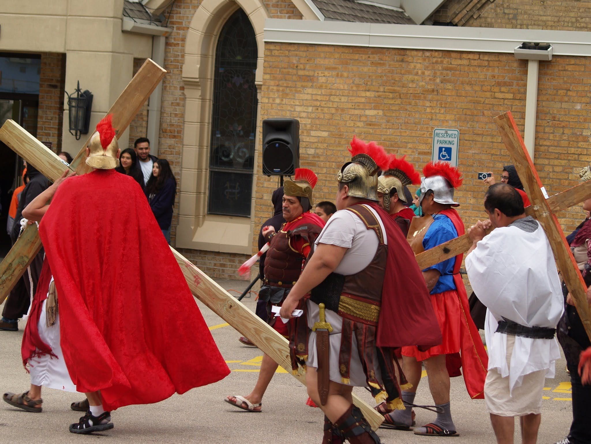 The reenactment drew around 100 faithful to follow Jesus from his condemnation by Pilate to his scourging and eventual crucifixion. The Stations began on one side of the parking lot, where Hispanic volunteers recreated the scene of Jesus being condemned to death. The prayers were said in Spanish, but the message hit home to the English-speaking attendees as well.