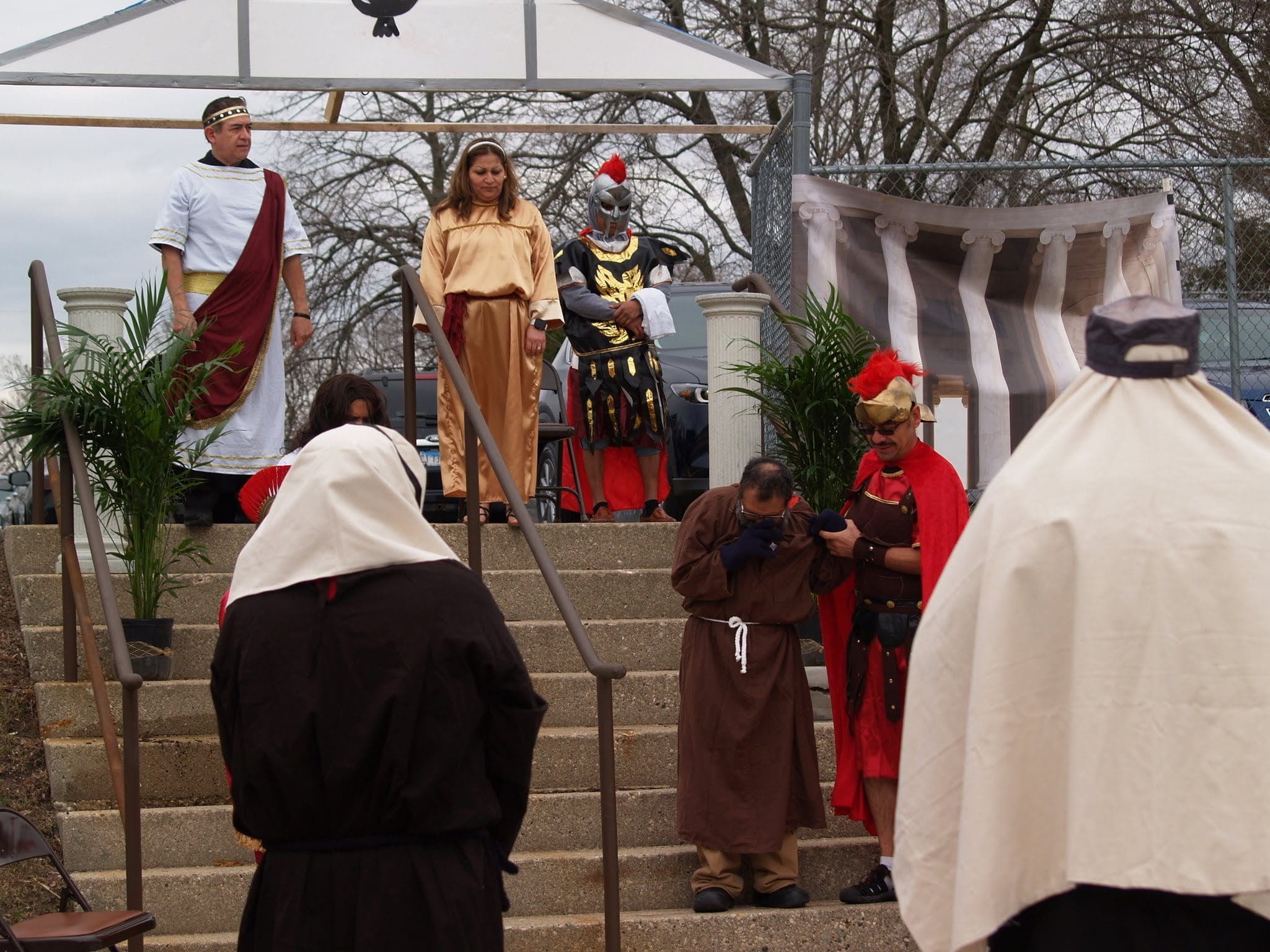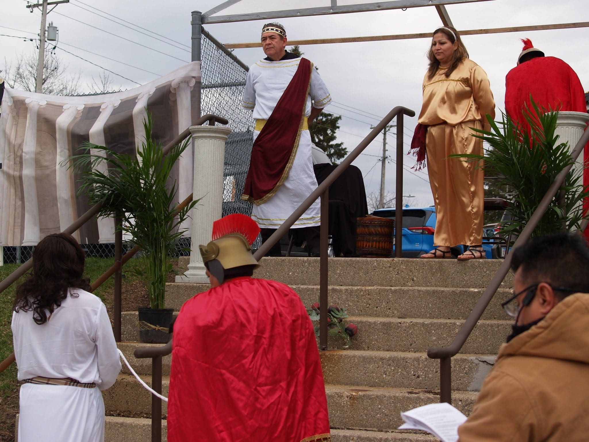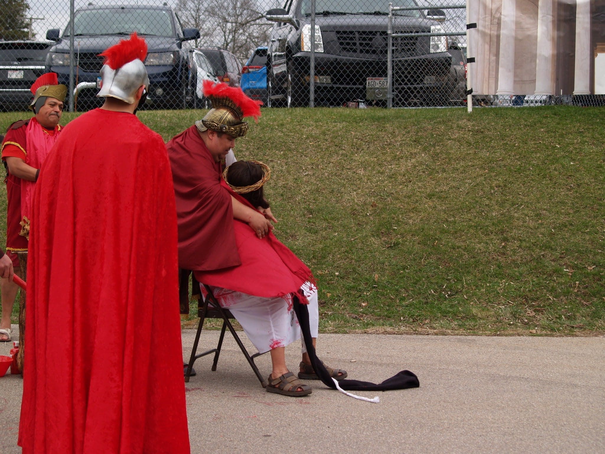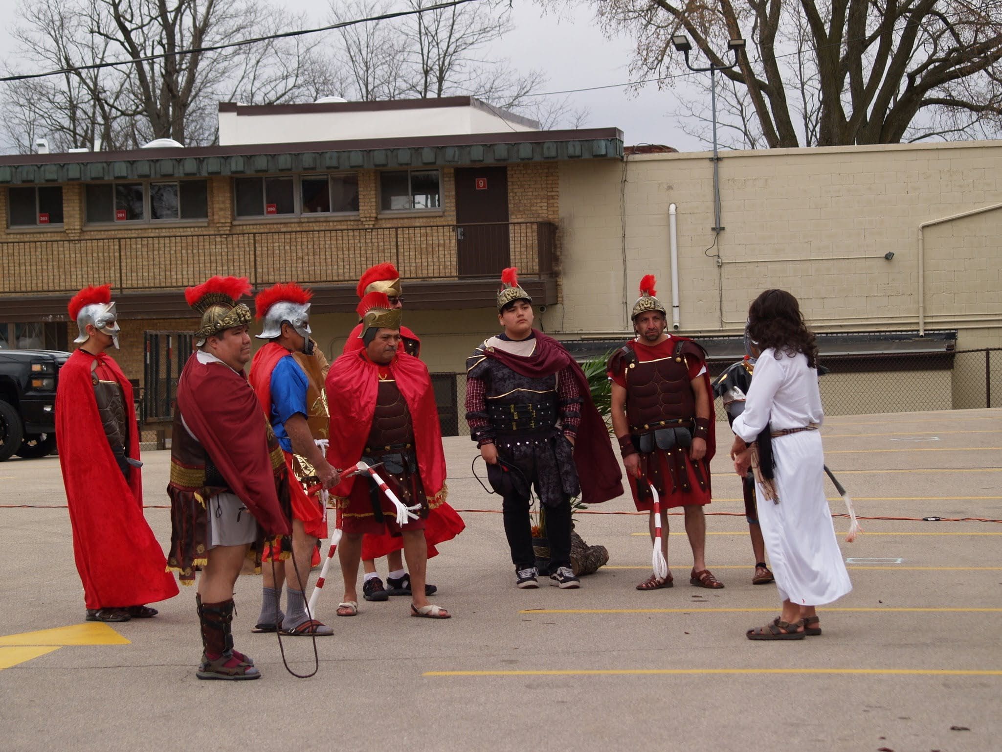 The reenactment drew around 100 faithful to follow Jesus from his condemnation by Pilate to his scourging and eventual crucifixion. The Stations began on one side of the parking lot, where Hispanic volunteers recreated the scene of Jesus being condemned to death. The prayers were said in Spanish, but the message hit home to the English-speaking attendees as well.