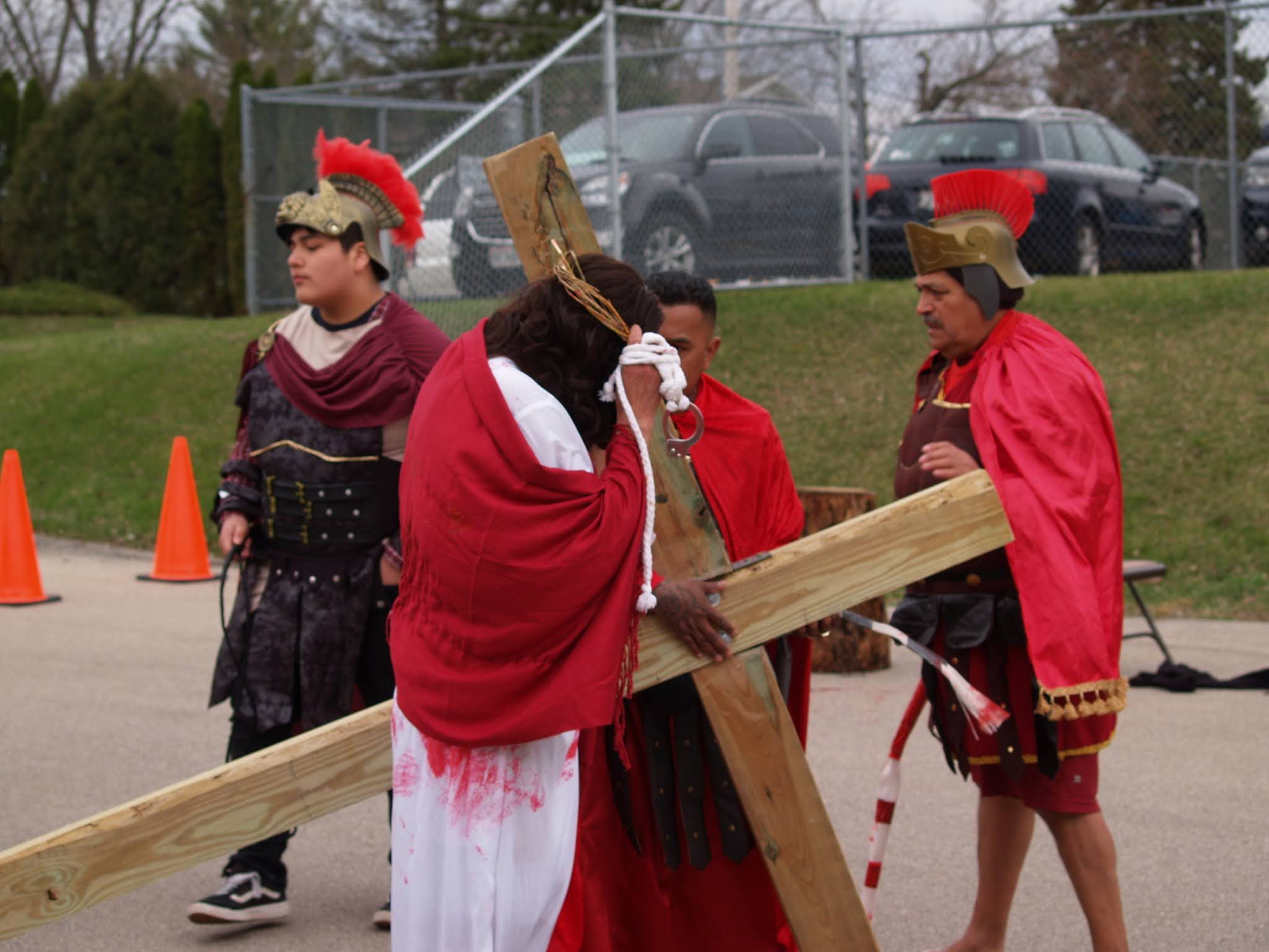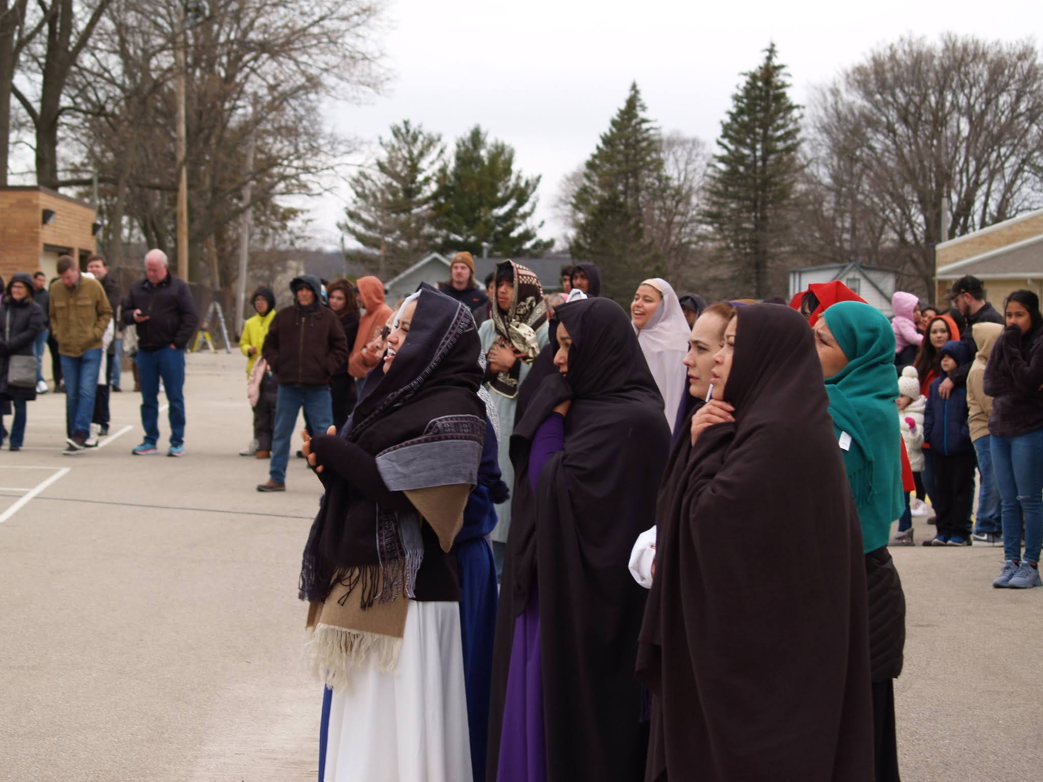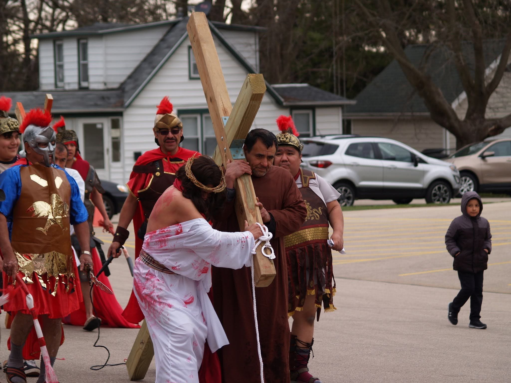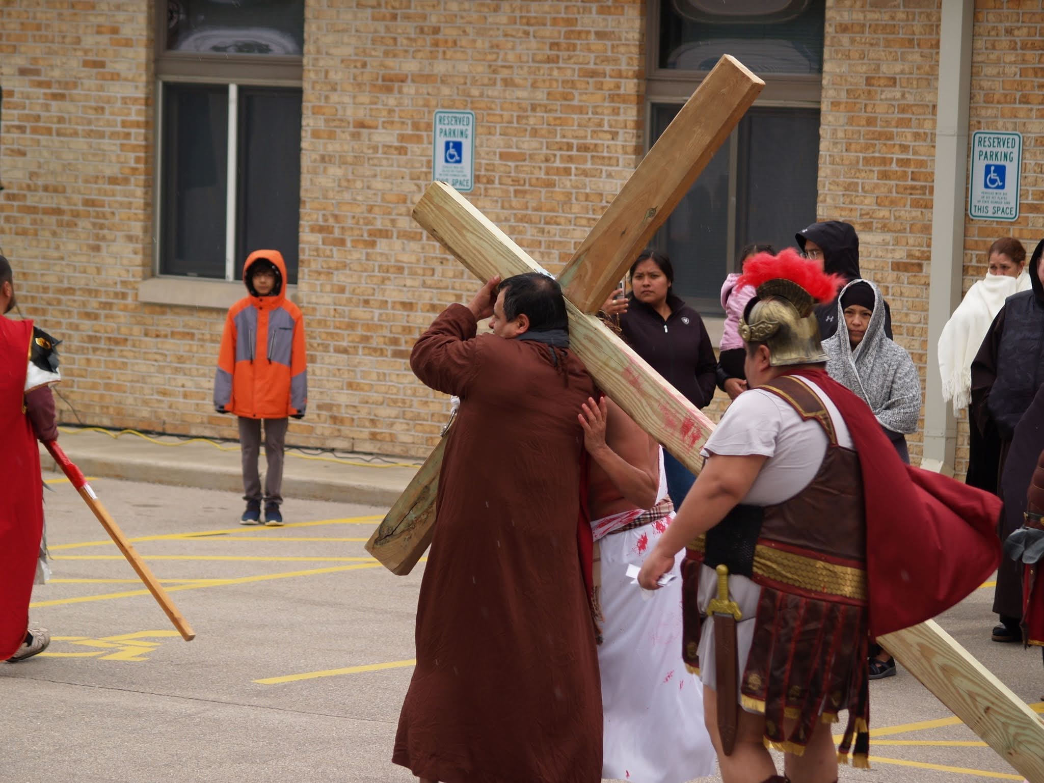 Frigid winds accompanied rain and snow under a mid-afternoon sky Good Friday as Jesus was portrayed by Juan Guerrero and the faithful reenacted the 14 Stations of the Cross in the St. Francis de Sales parking lot in Lake Geneva.