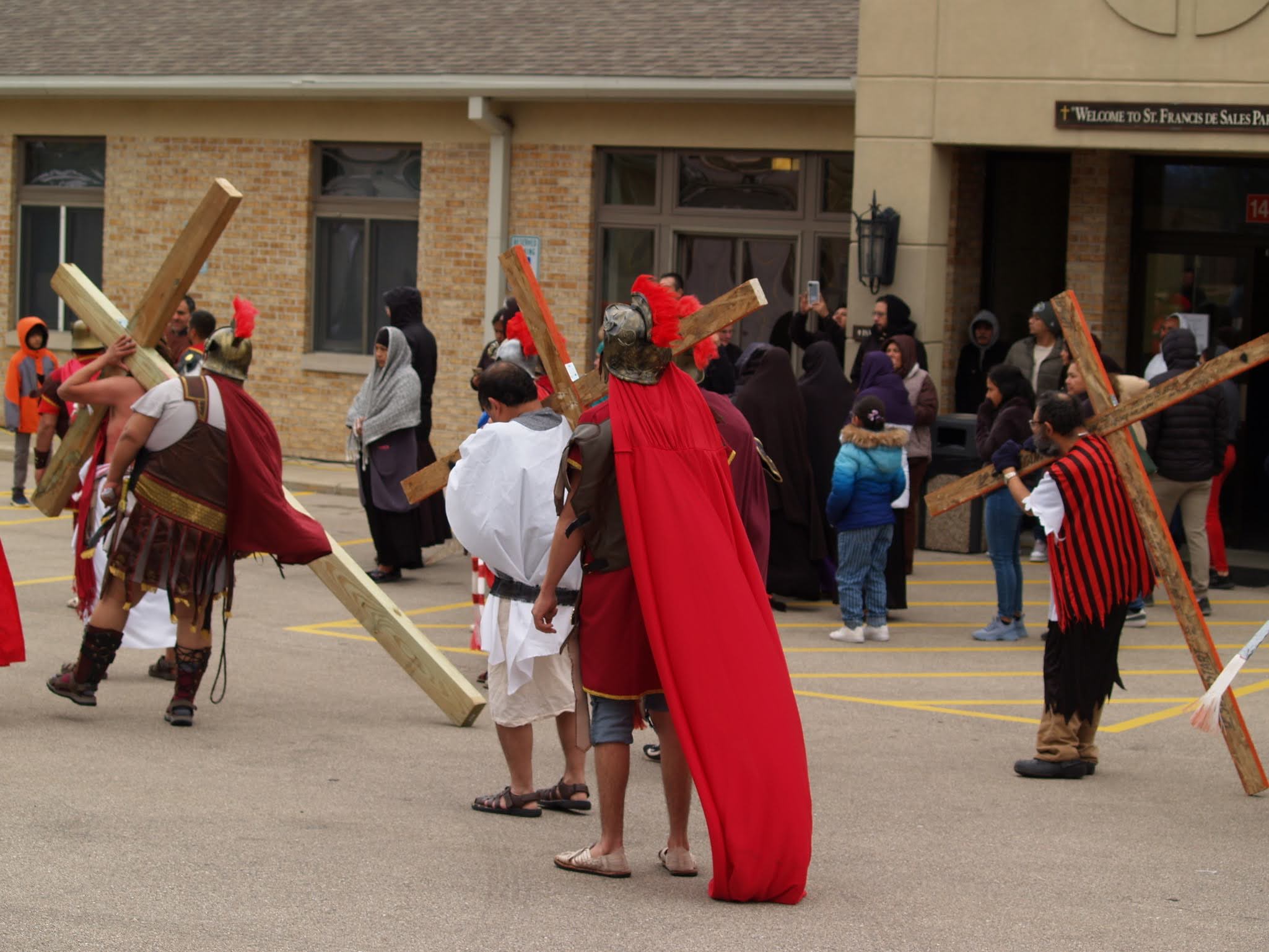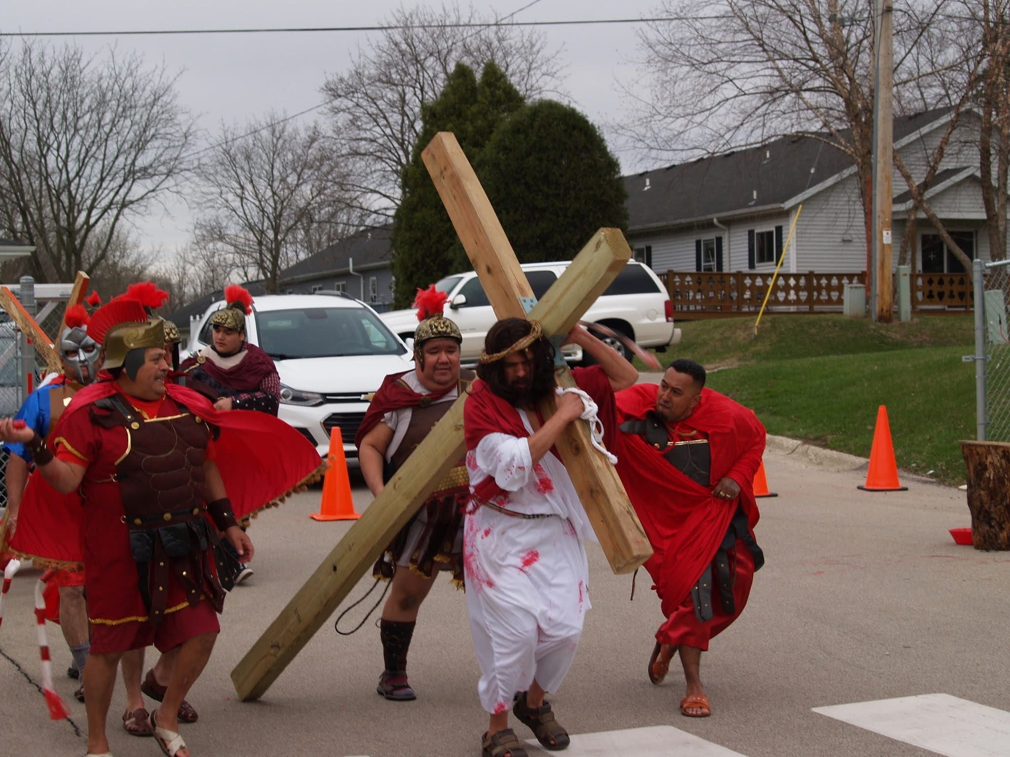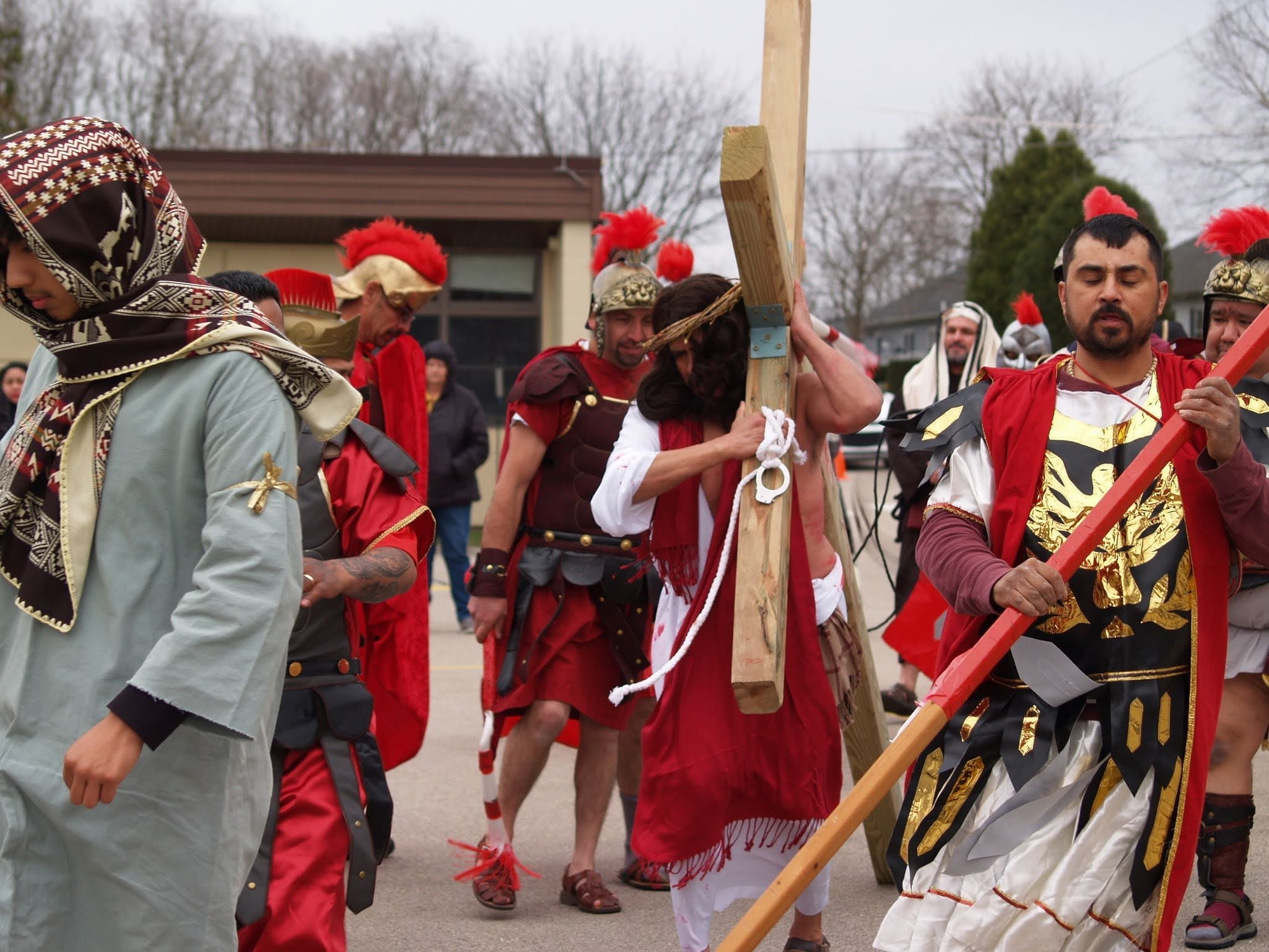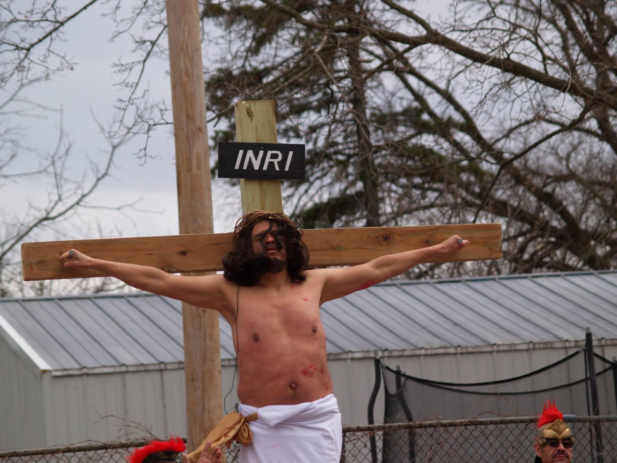 Frigid winds accompanied rain and snow under a mid-afternoon sky Good Friday as Jesus was portrayed by Juan Guerrero and the faithful reenacted the 14 Stations of the Cross in the St. Francis de Sales parking lot in Lake Geneva.