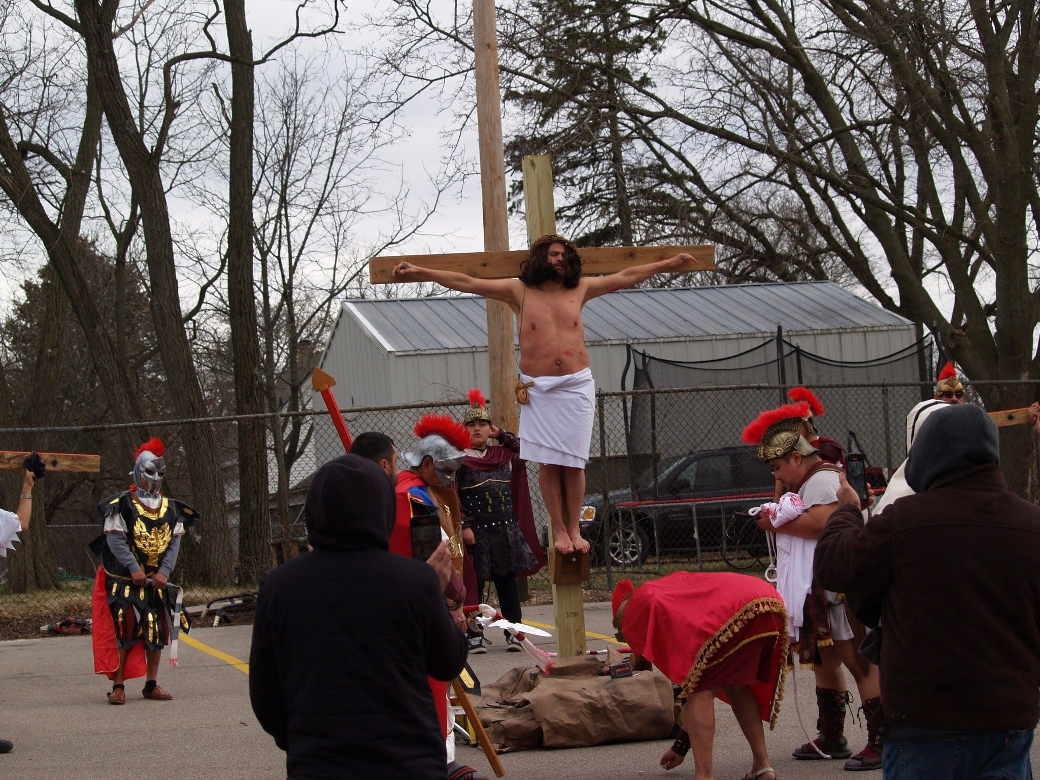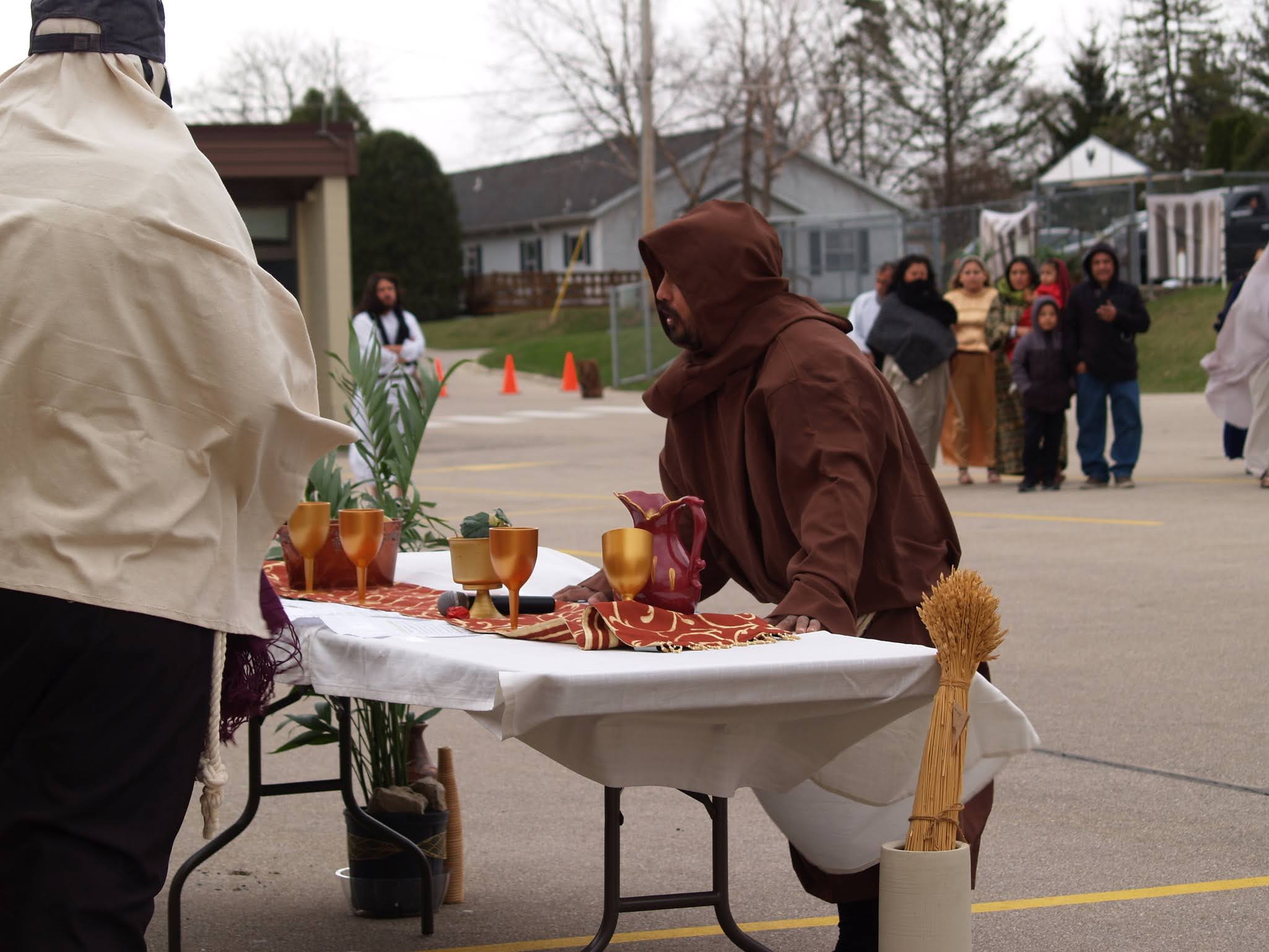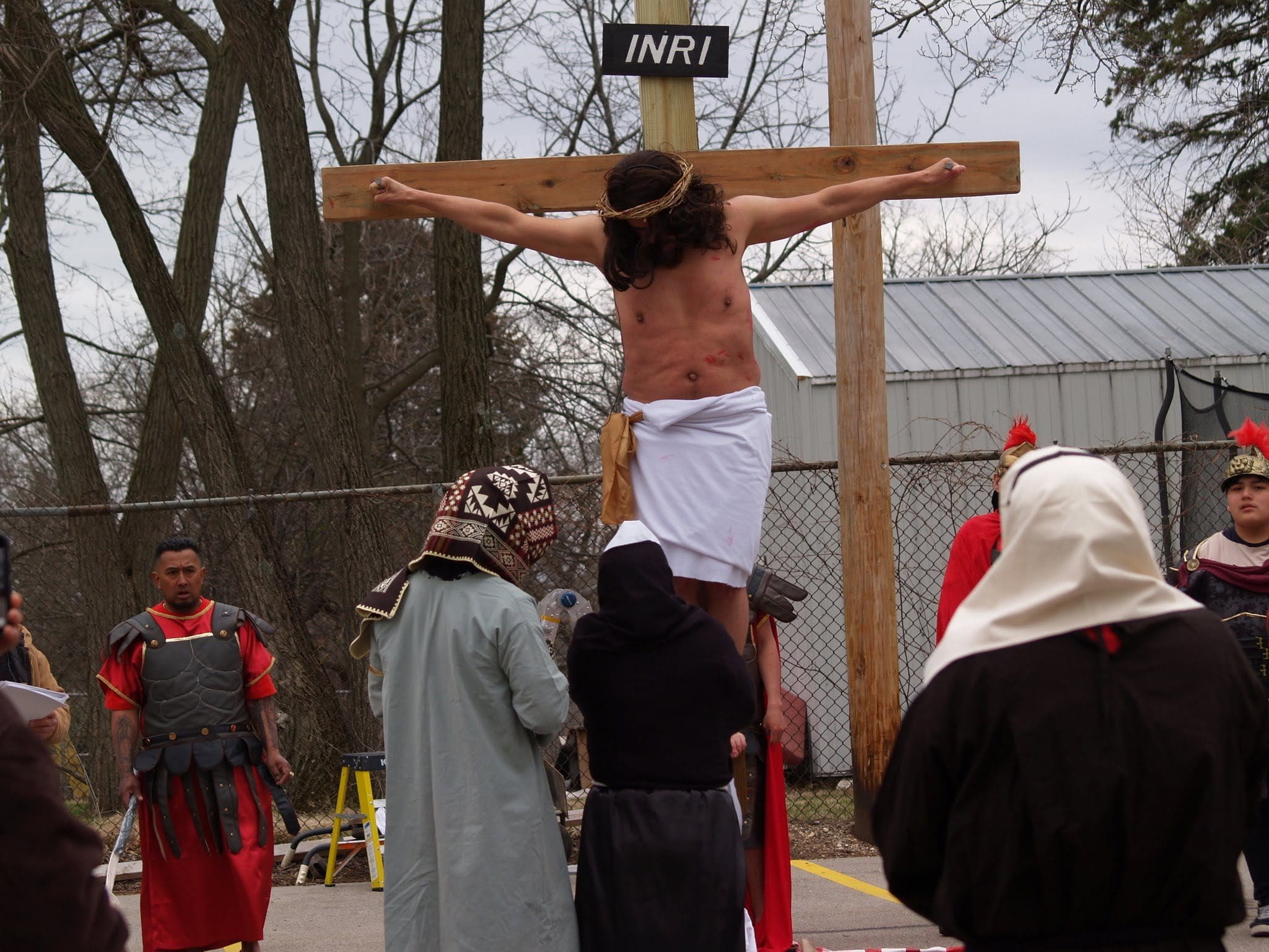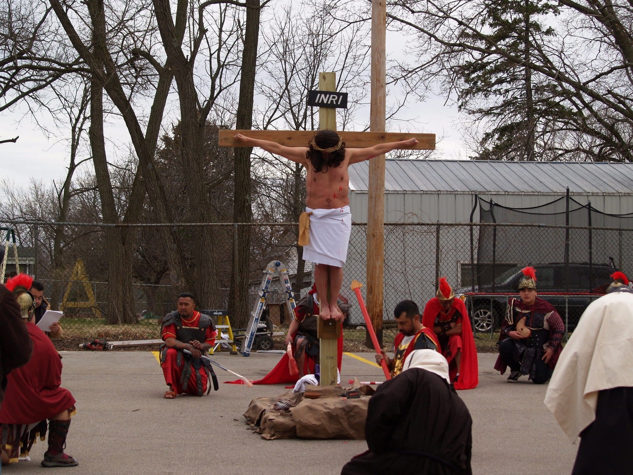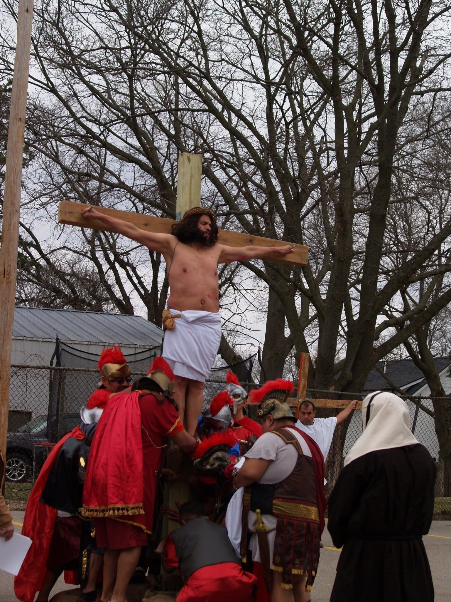 Frigid winds accompanied rain and snow under a mid-afternoon sky Good Friday as Jesus was portrayed by Juan Guerrero and the faithful reenacted the 14 Stations of the Cross in the St. Francis de Sales parking lot in Lake Geneva.