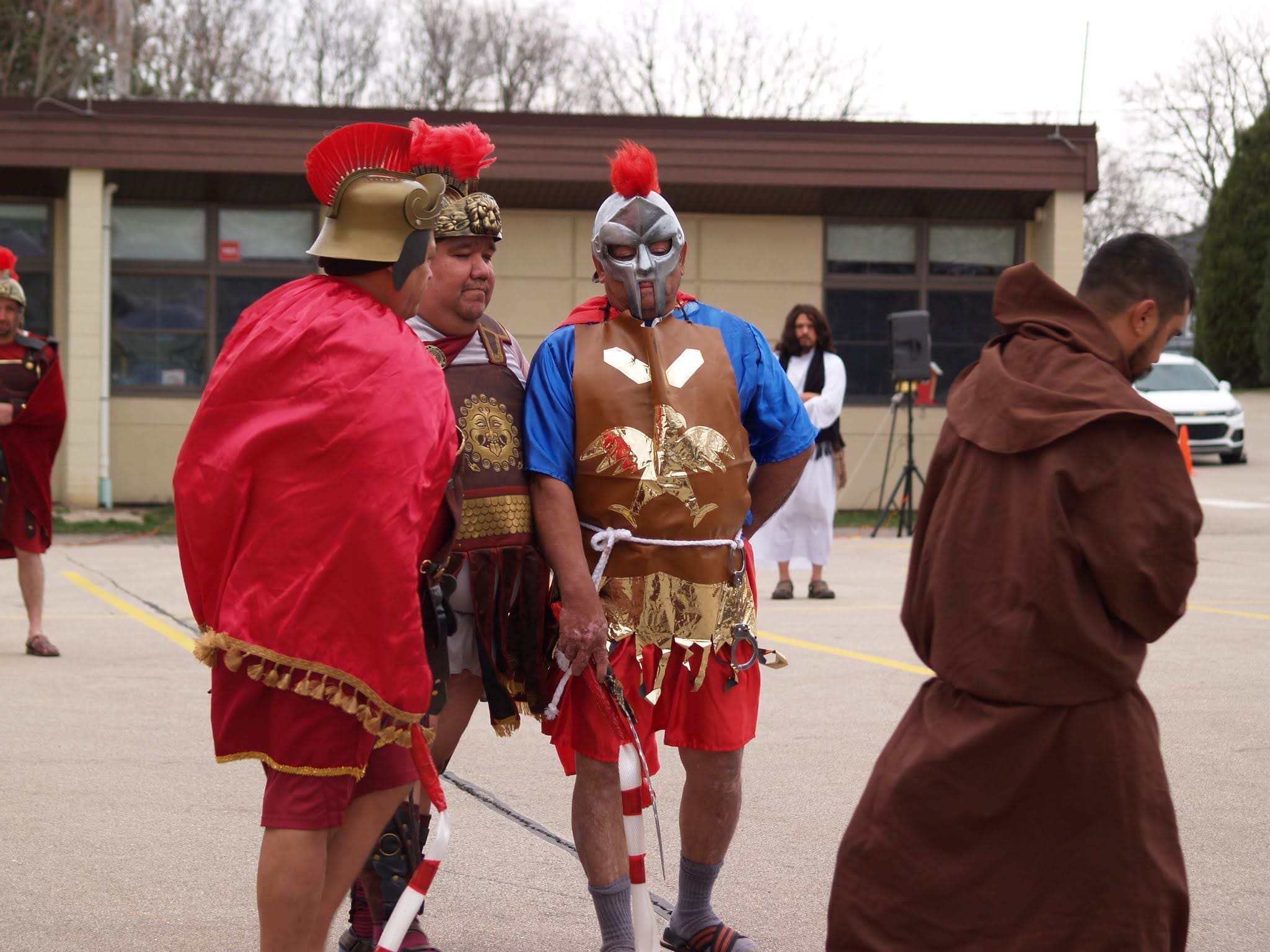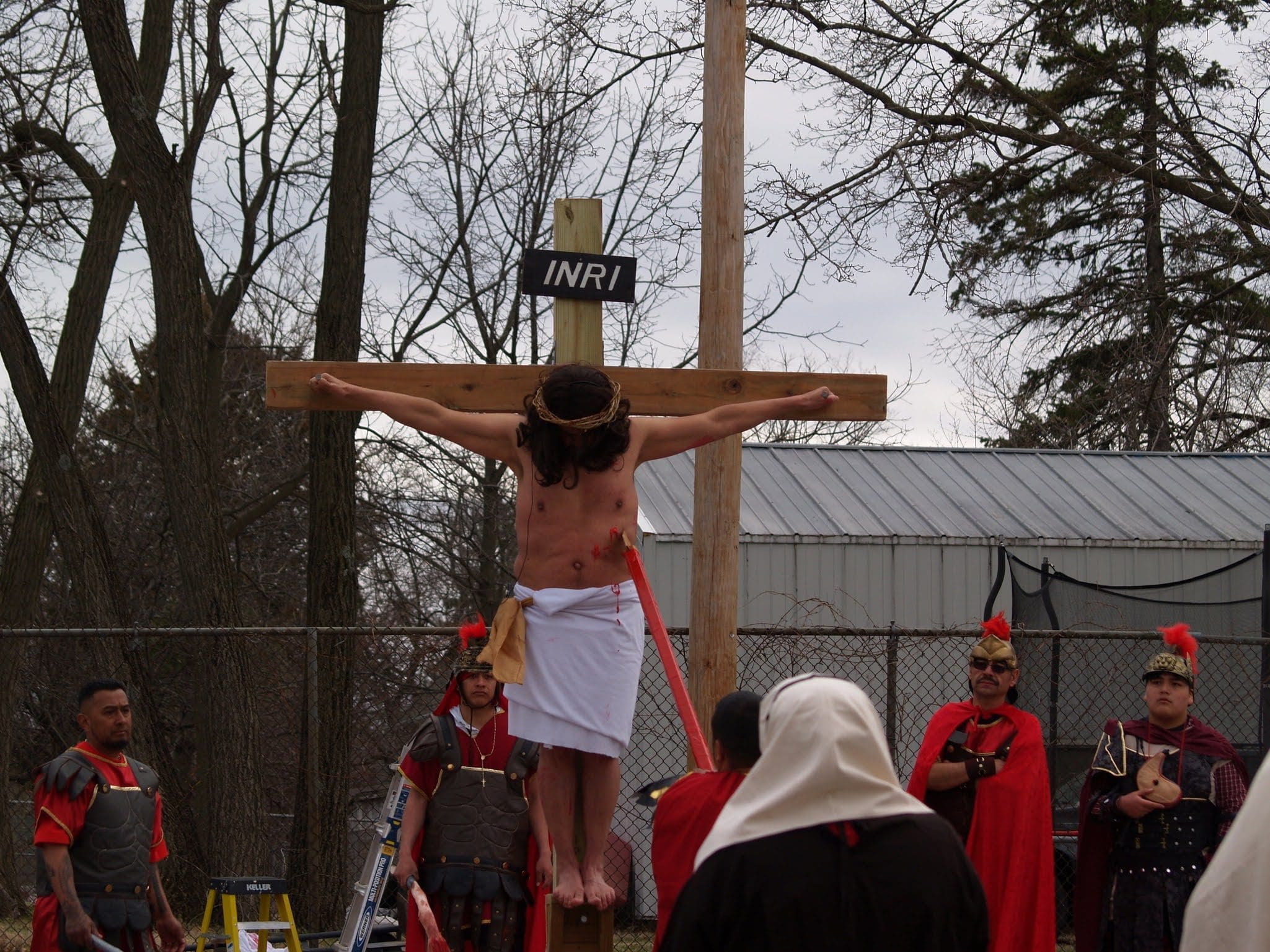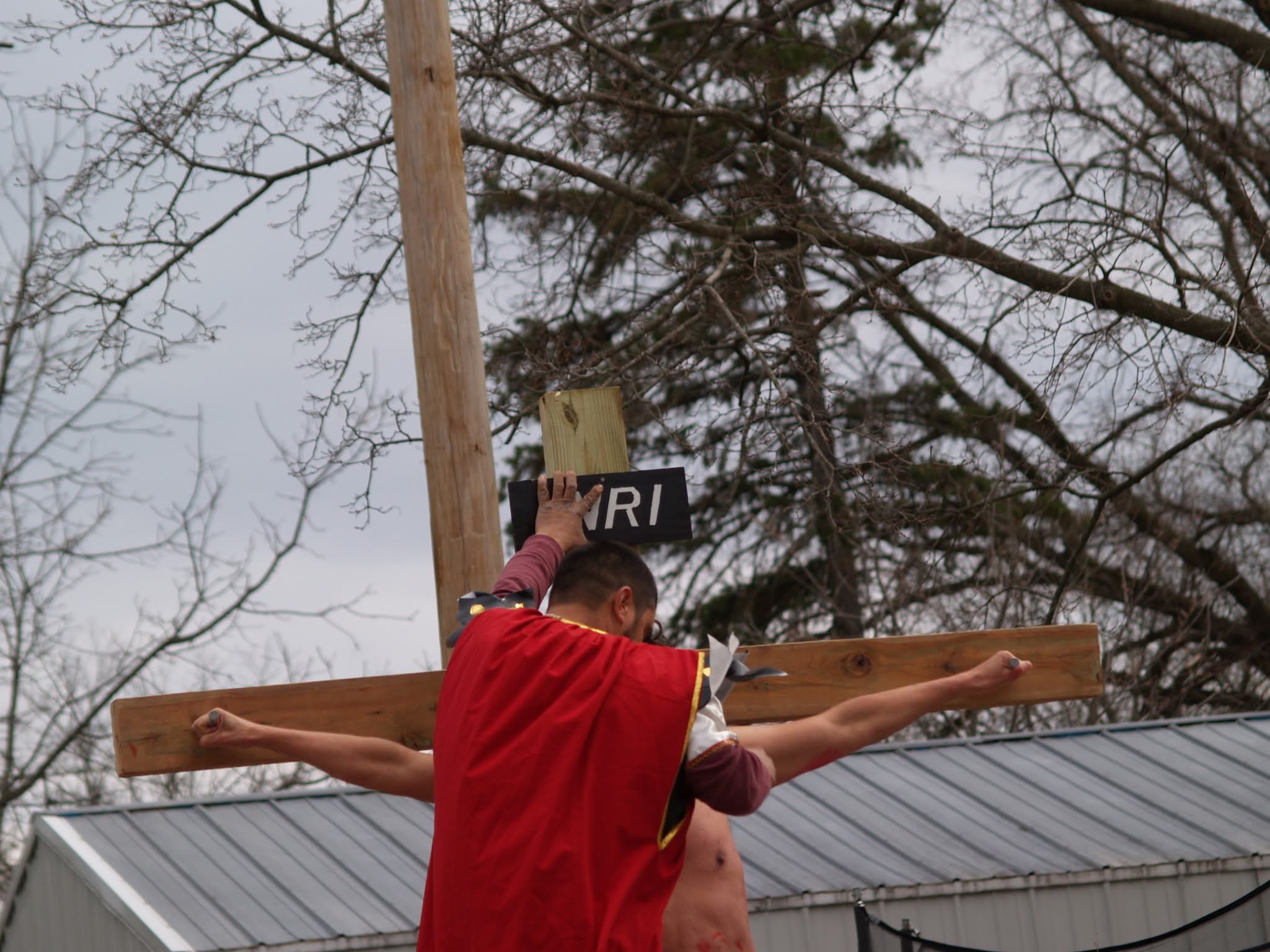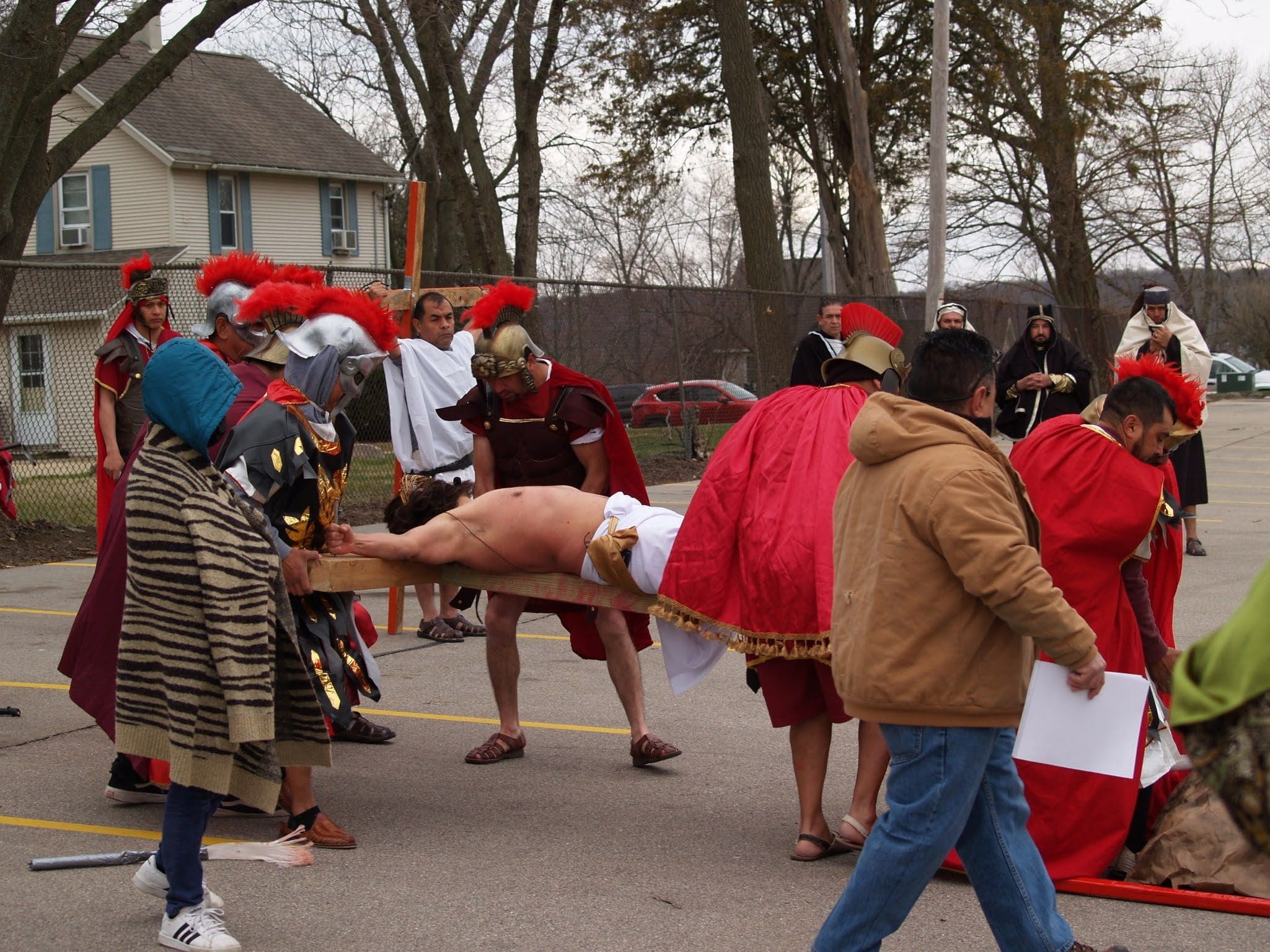 Frigid winds accompanied rain and snow under a mid-afternoon sky Good Friday as Jesus was portrayed by Juan Guerrero and the faithful reenacted the 14 Stations of the Cross in the St. Francis de Sales parking lot in Lake Geneva.
