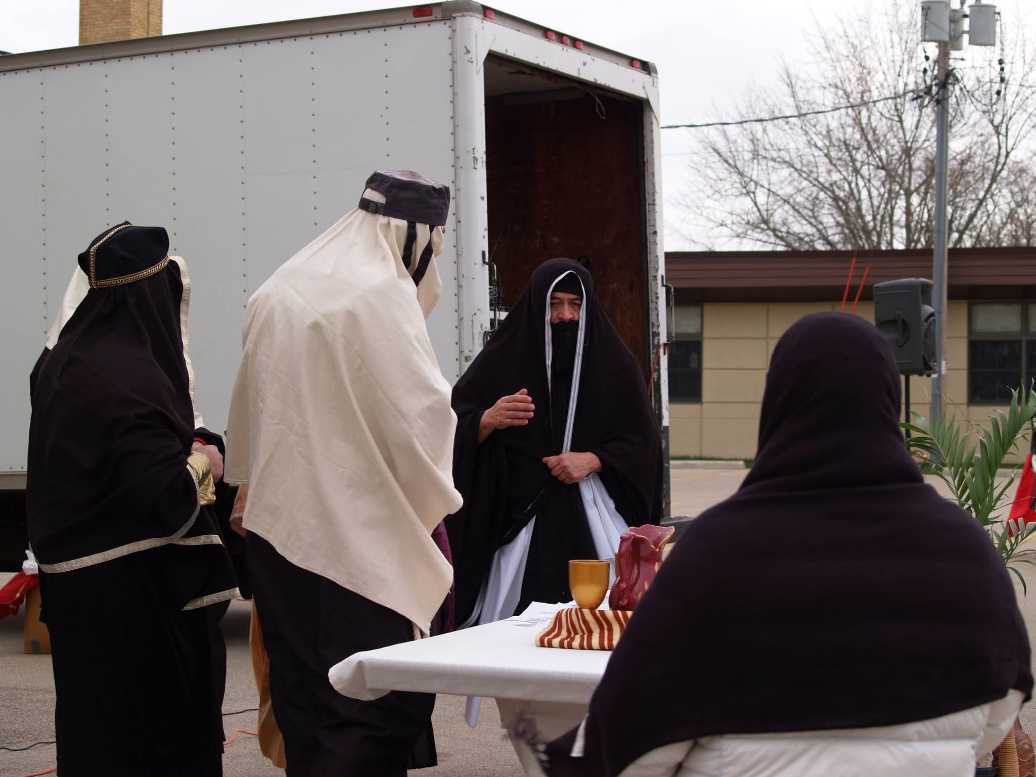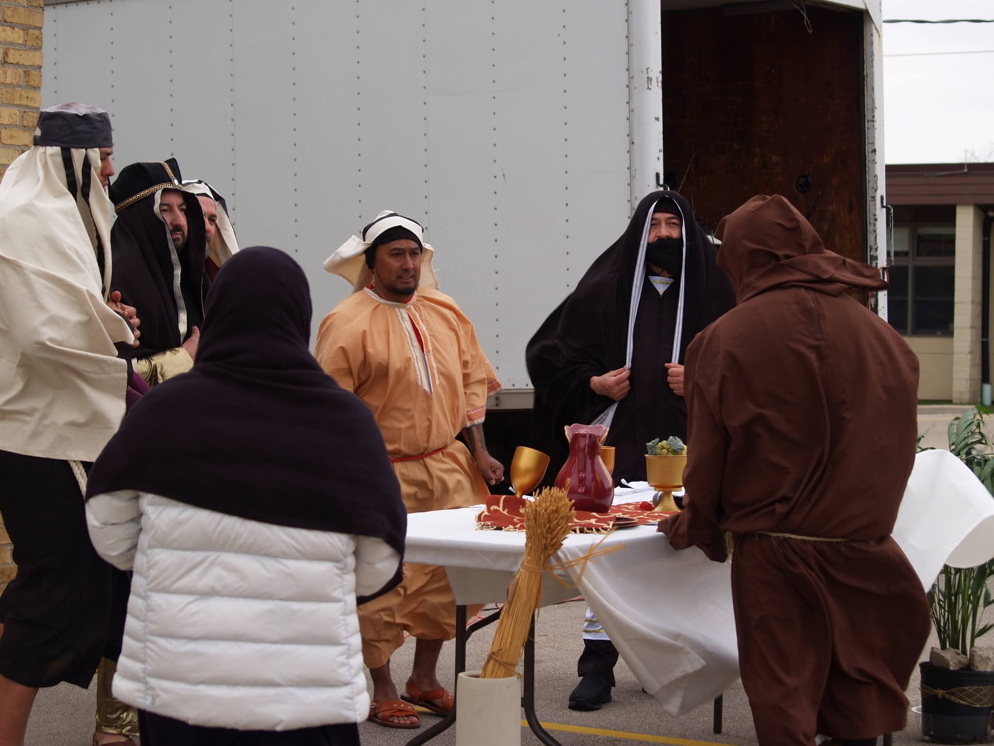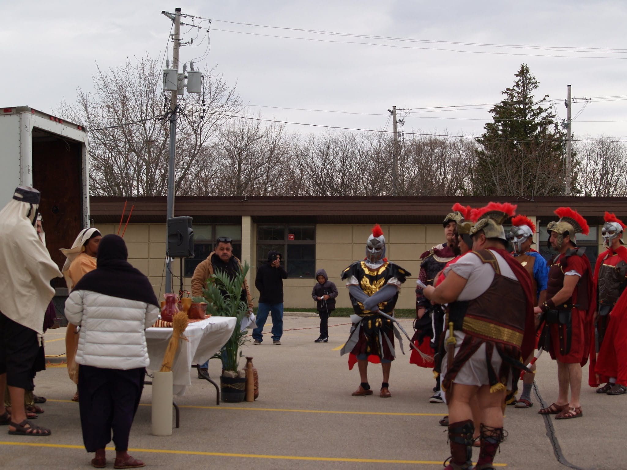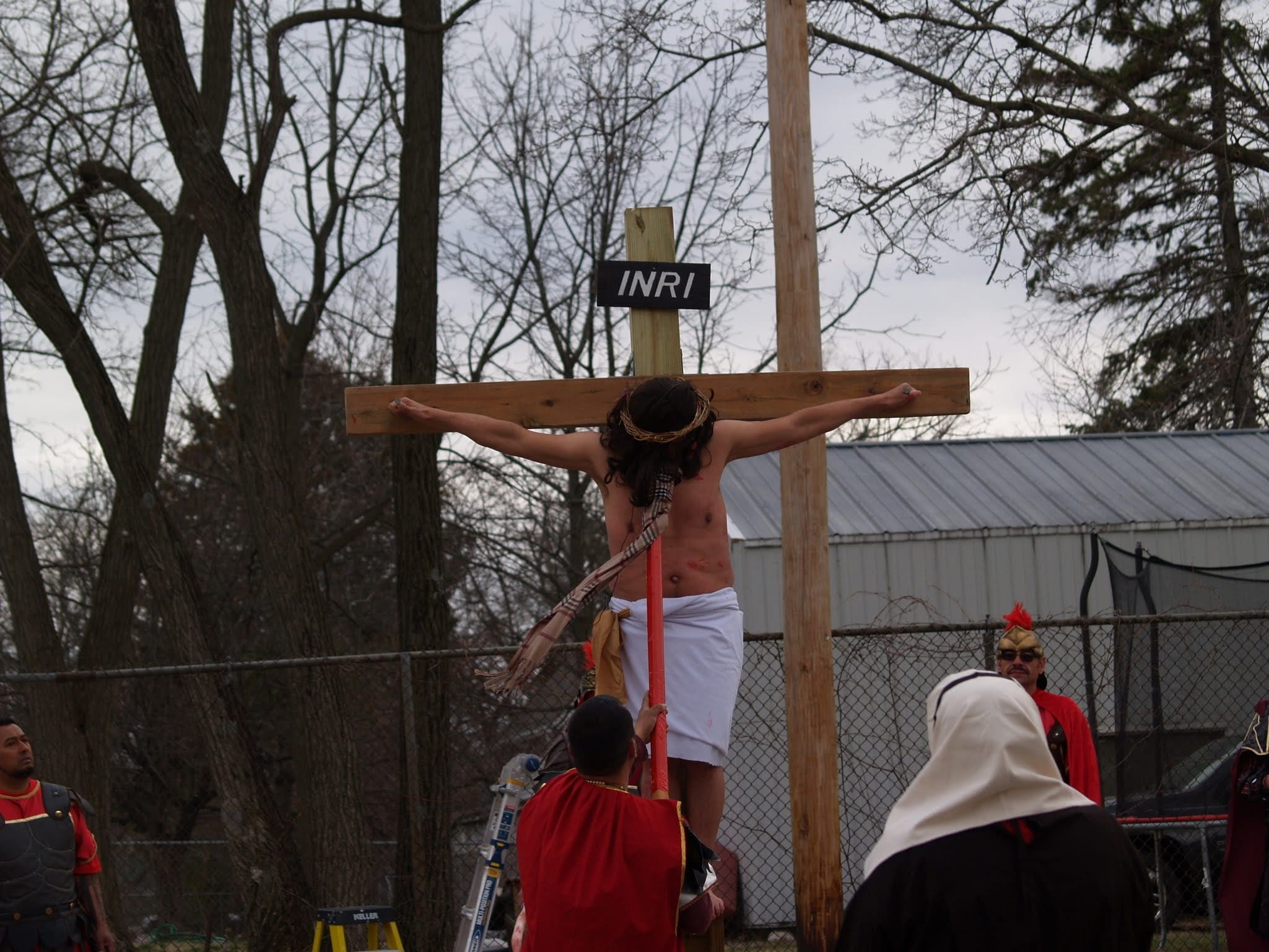 Frigid winds accompanied rain and snow under a mid-afternoon sky Good Friday as Jesus was portrayed by Juan Guerrero and the faithful reenacted the 14 Stations of the Cross in the St. Francis de Sales parking lot in Lake Geneva.