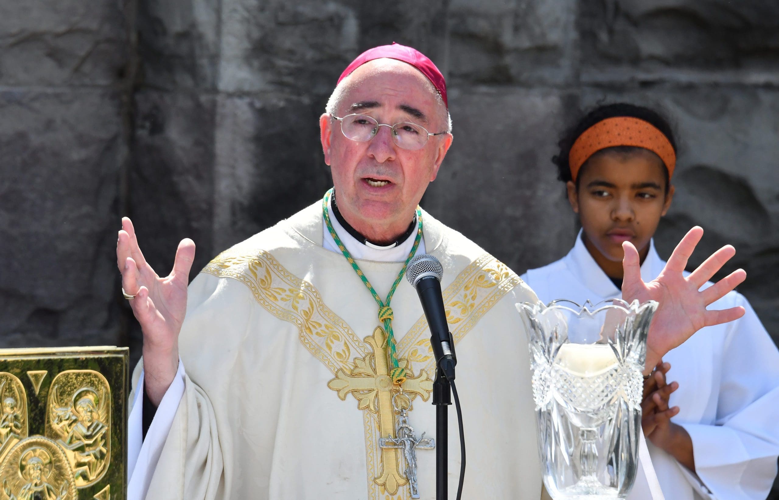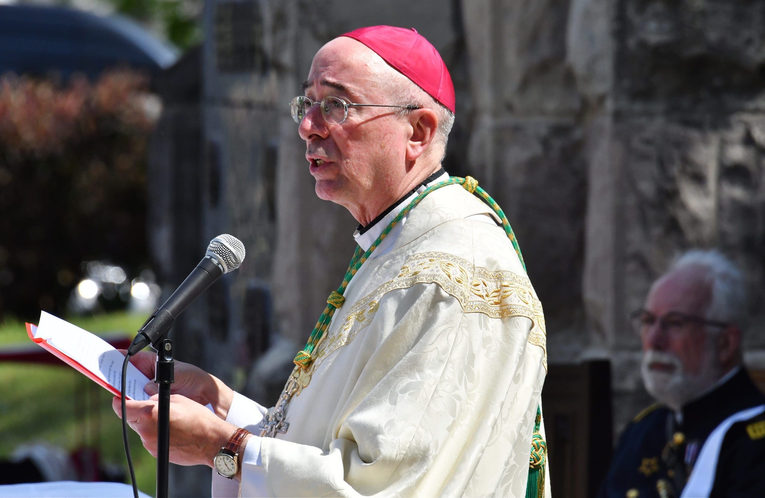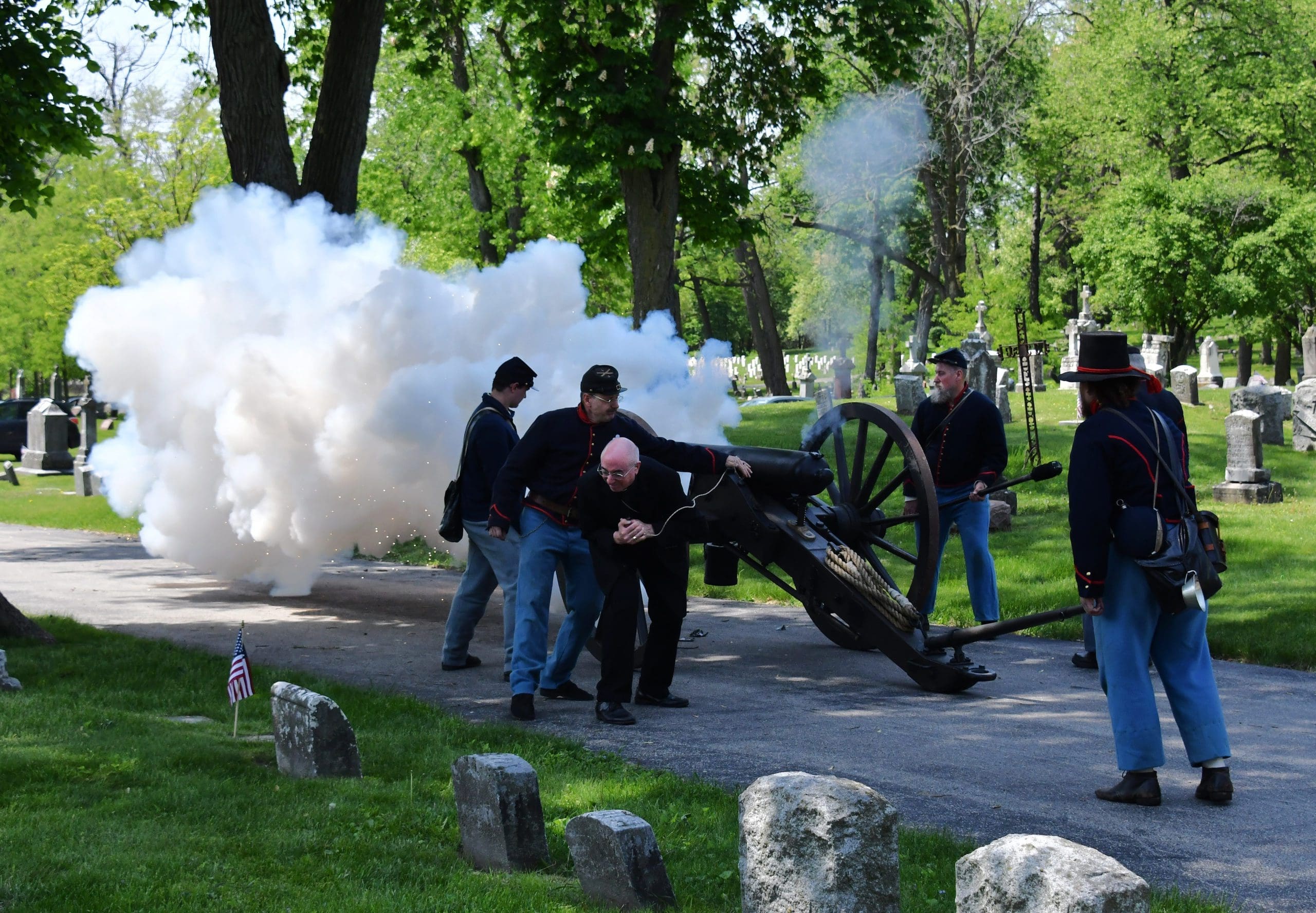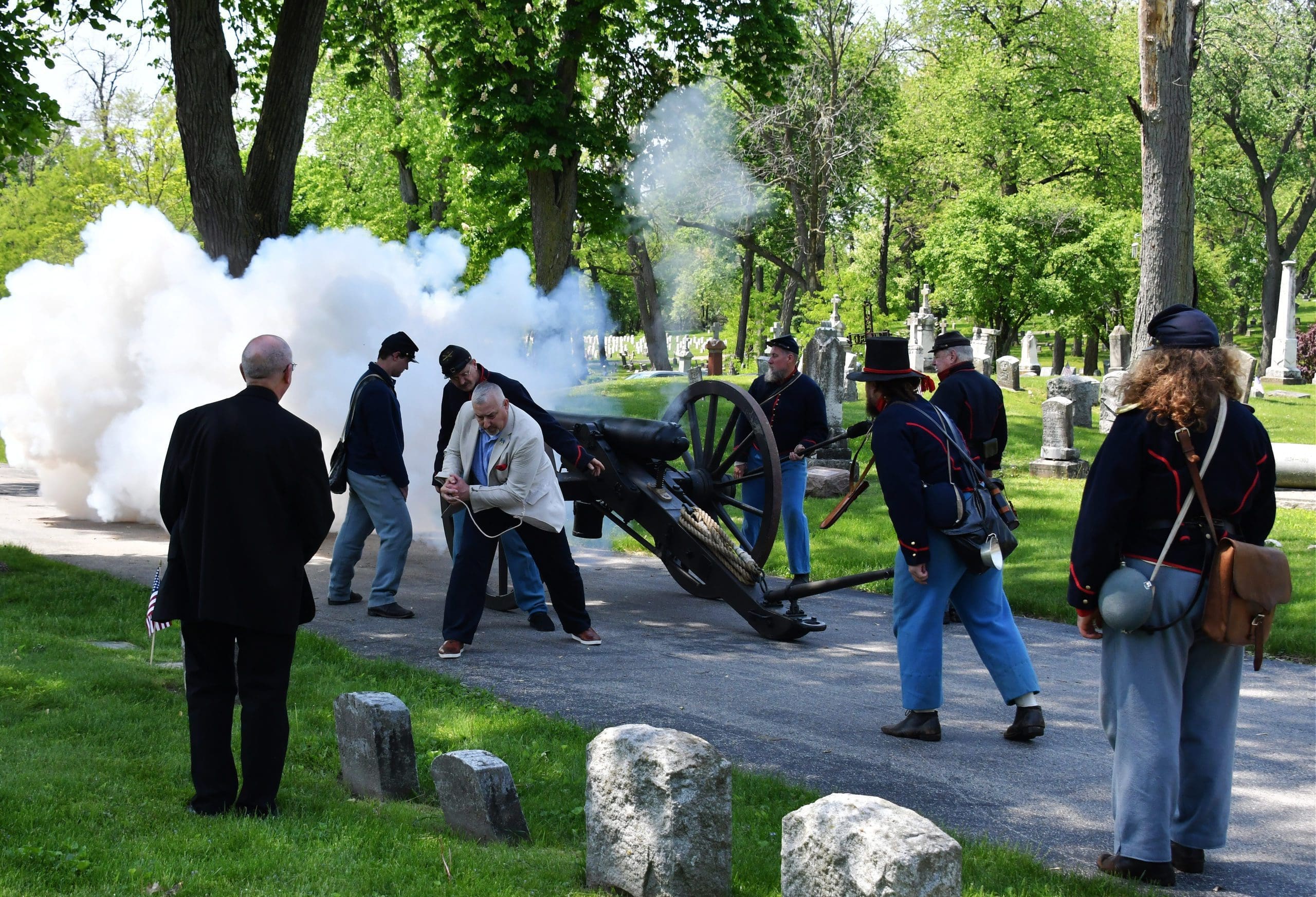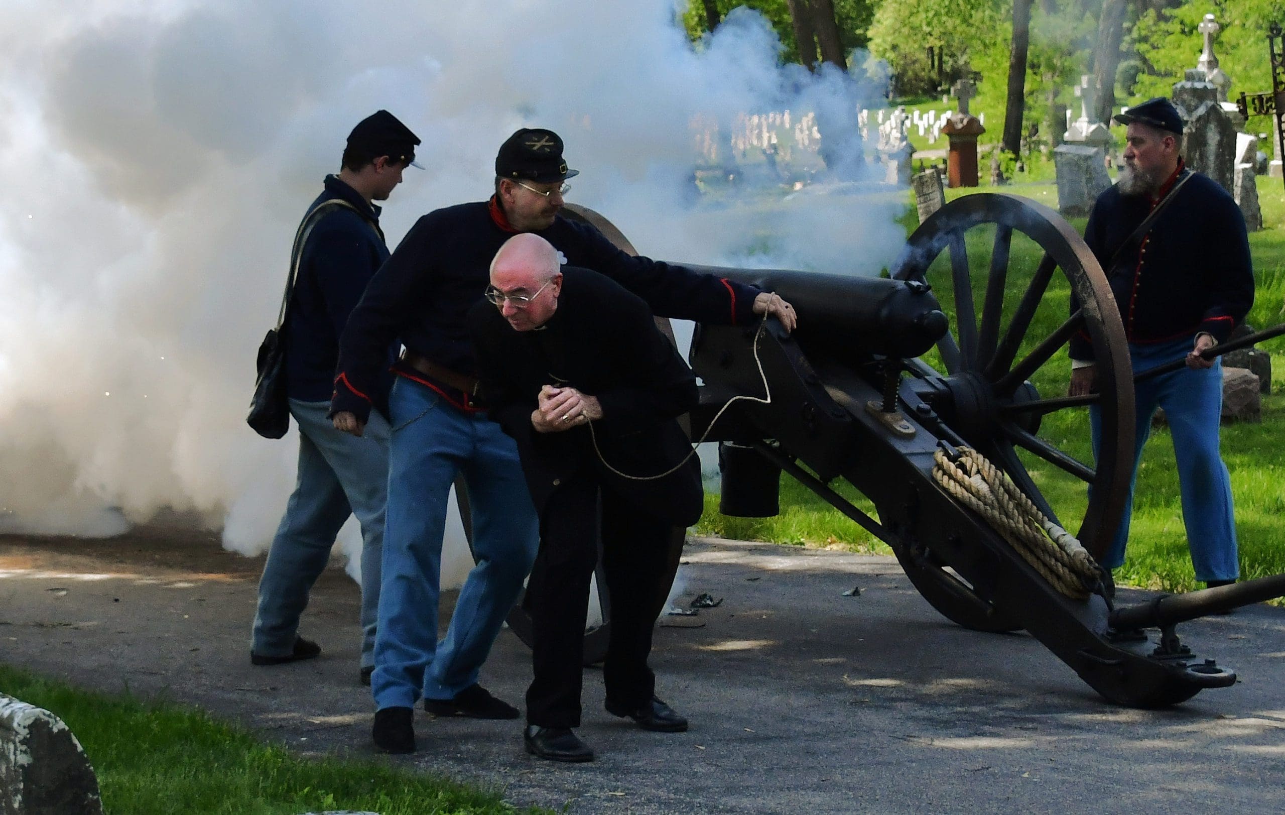 Bishop James T. Schuerman fires a cannon during a Memorial Day Mass at Calvary Cemetery. (Photos by David Bernacchi)