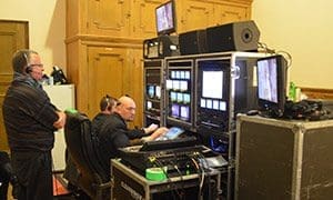 Producer Raul Galvan, left, from Milwaukee Public Television oversees production of the live telecast of Midnight Mass from the Cathedral of St. John the Evangelist, Dec. 25. At the console are engineer Matt Abstetar and director Trevor Powers, foreground, both from Clearwing Productions. The cathedral sacristy served as the control room for the production. It was the first time since 1995 that Midnight Mass from the cathedral had been televised. (Submitted photos courtesy Cathedral of St. John the Evangelist) additional chairs than would be needed for a “typical Mass.”