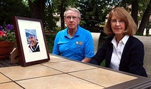 Mary Kay and Don Balchunas sit in the backyard of their New Berlin home with a picture of their son, Jay, who was killed at age 34 while on duty as a Wisconsin Department of Justice Special Agent in 2004. Mary Kay will be honored by the Sisters of the Divine Savior as their 15th annual Woman of Faith on Sept. 17. (Catholic Herald photo by Allen Fredrickson)But this time, it was different. This time, it was Mary Kay and her husband, Don, anxiously keeping vigil in the Froedtert Hospital emergency room. They had been roused from sleep at 1:20 in the morning by a phone call from their son Jay’s employer at the Wisconsin Department of Justice.