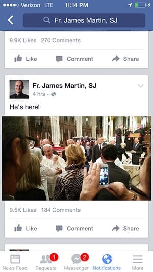 At 83 years old, Fotsch walks well, but for an event this big, Lawton was worried about getting her through the crowds. As A cellphone screen shot of Jesuit Fr. James Martin’s Facebook page which includes a photo of Pope Francis greeting Geri “Nana” Fotsch at St. Patrick’s Cathedral on Sept. 24.part of the initial invitation from Cardinal Dolan, mother and daughter attended a small reception behind the cathedral before the service.