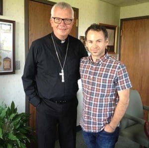 Mike Mangione, a member of St. Francis Borgia Parish, Cedarburg, is pictured with Bishop Donald J. Hying in this undated photo. Mangione, a musician, along with Christopher West, will give two presentations in the archdiocese later this month. (Submitted photo courtesy Mike Mangione)