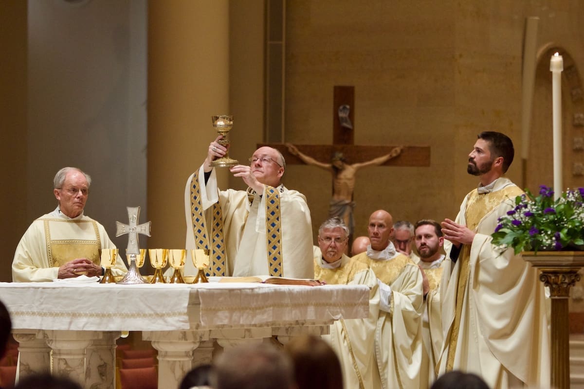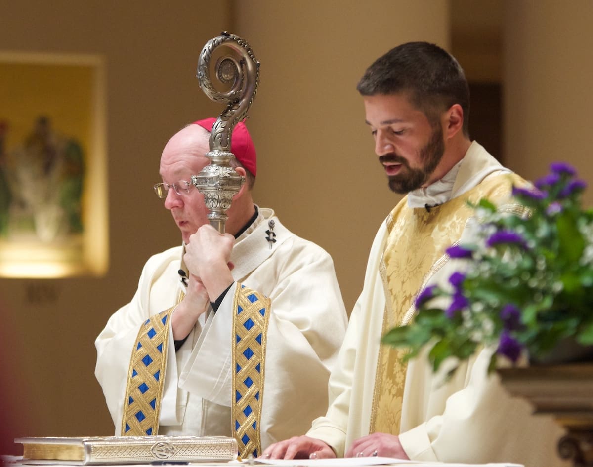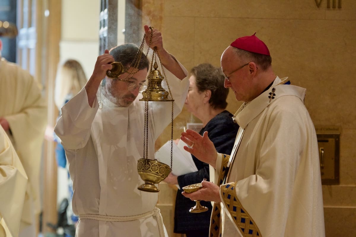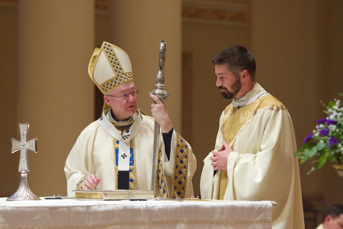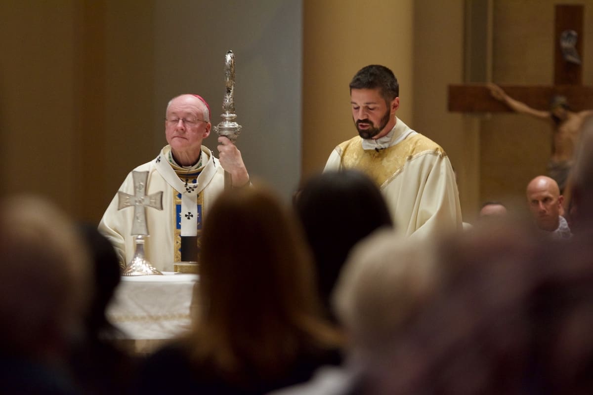 Archbishop Jeffrey S. Grob presided as Fr. Edward Sanchez was formally installed March 24 as rector of the Cathedral of St. John the Evangelist, affirming his leadership of the archdiocese’s Mother Church and its downtown mission. (Photo by seansmithphotos.com)