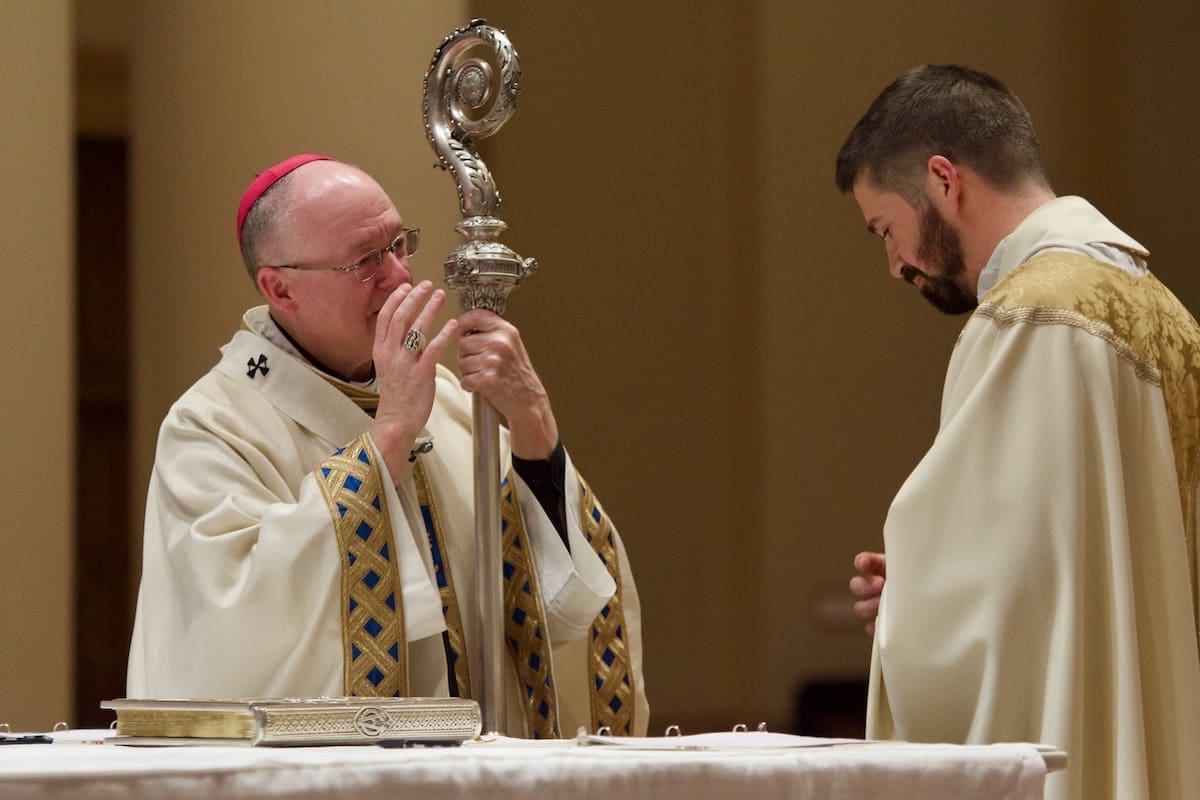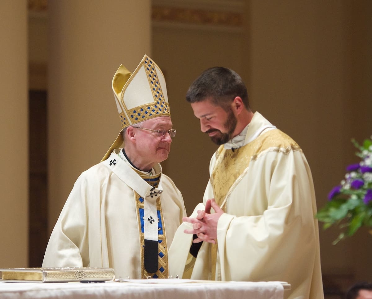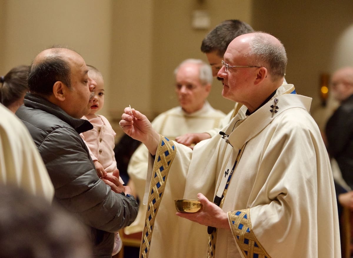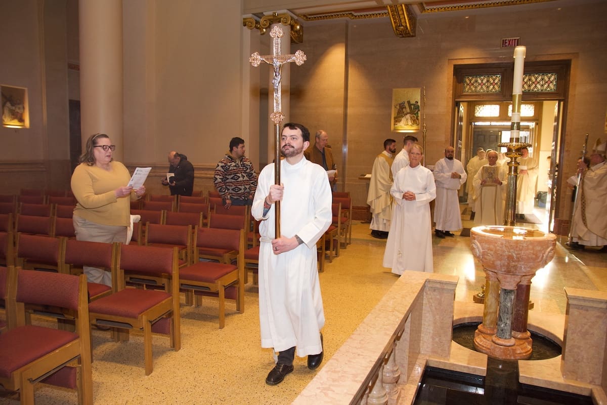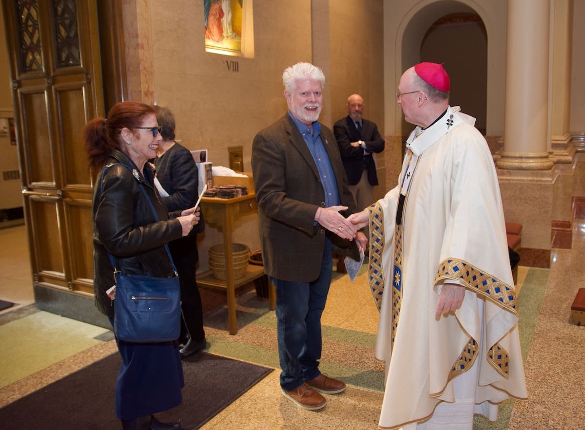 Archbishop Jeffrey S. Grob presided as Fr. Edward Sanchez was formally installed March 24 as rector of the Cathedral of St. John the Evangelist, affirming his leadership of the archdiocese’s Mother Church and its downtown mission. (Photo by seansmithphotos.com)