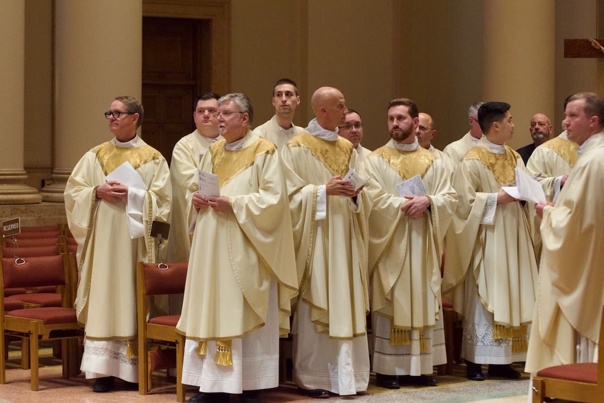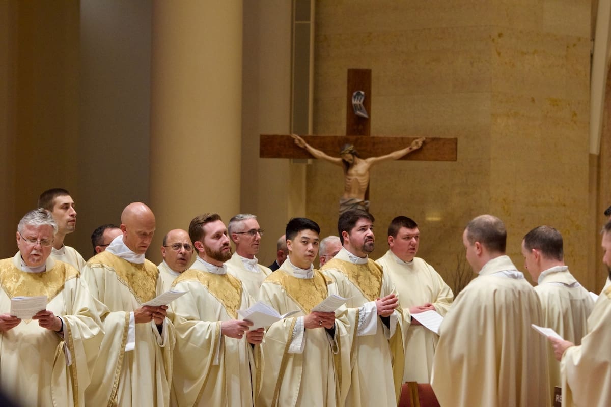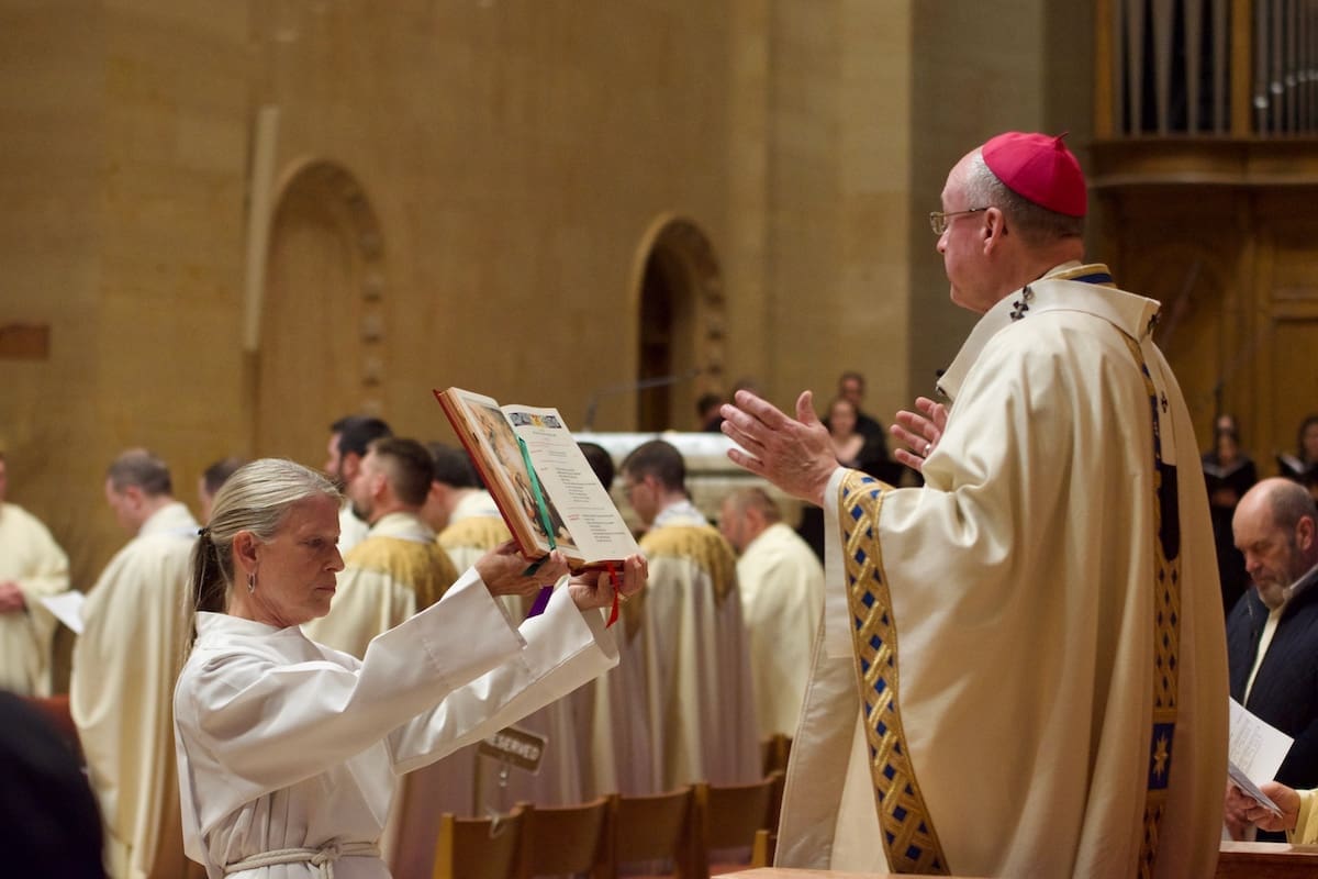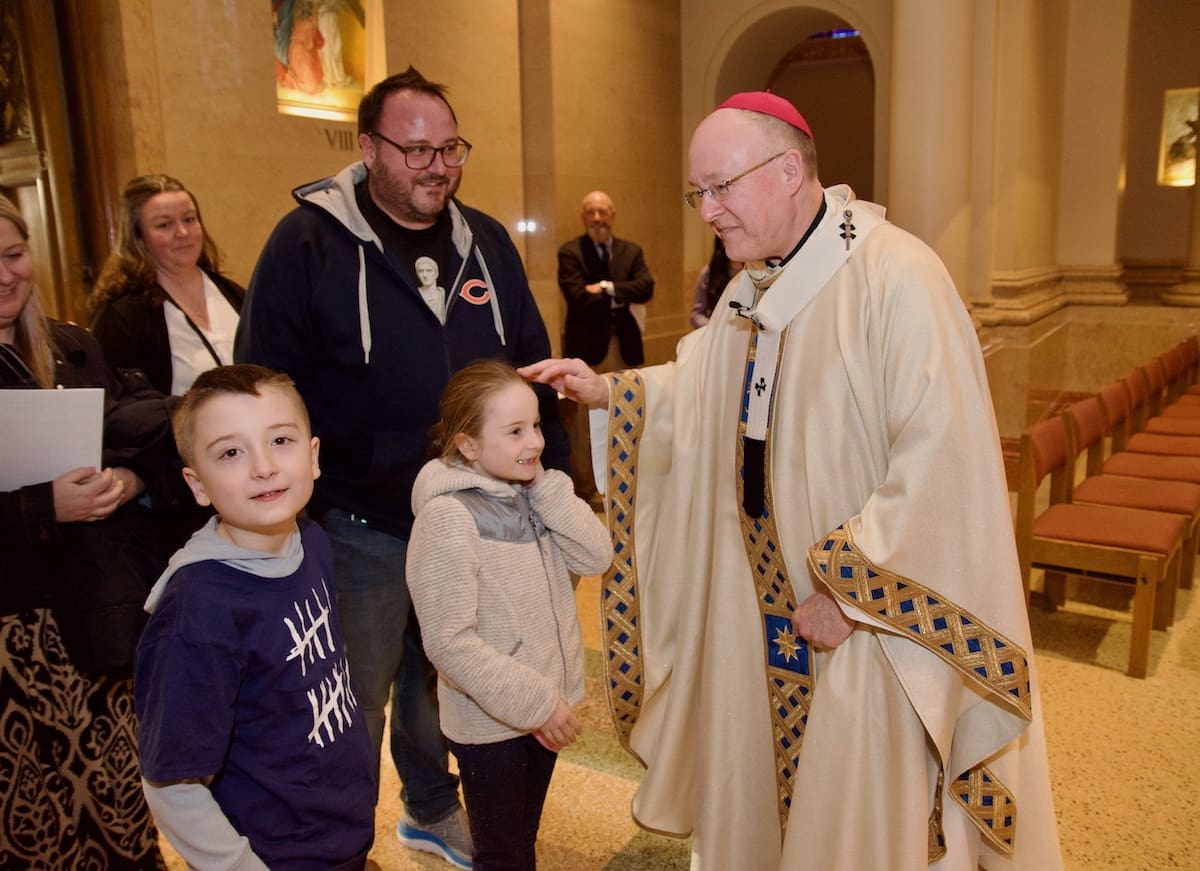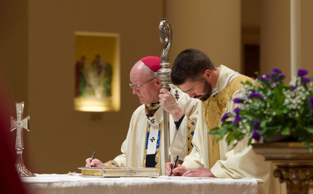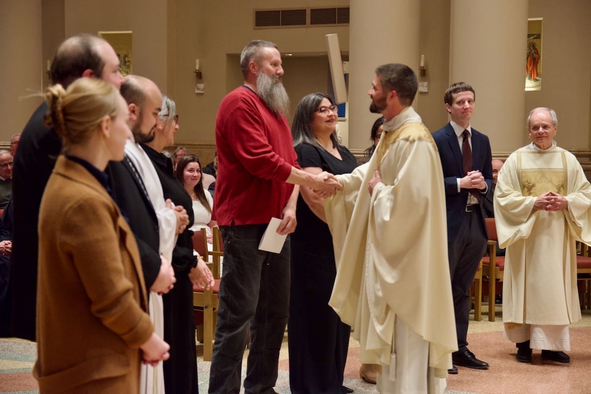 Archbishop Jeffrey S. Grob presided as Fr. Edward Sanchez was formally installed March 24 as rector of the Cathedral of St. John the Evangelist, affirming his leadership of the archdiocese’s Mother Church and its downtown mission. (Photo by seansmithphotos.com)