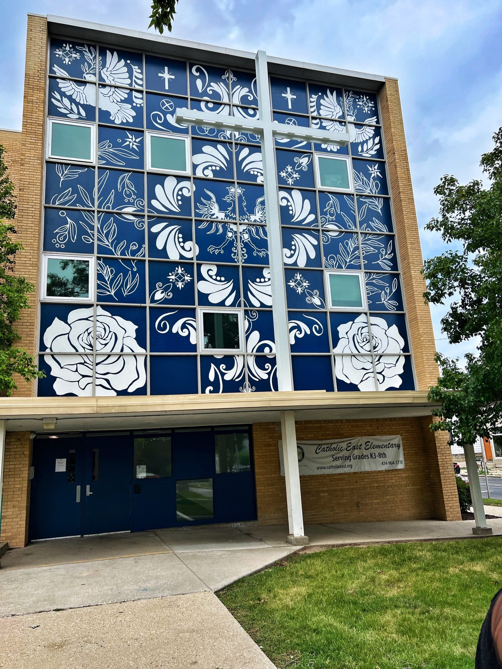 Catholic East Elementary School is unique in the archdiocese in that it serves five parishes spread across seven churches. Building a cohesive school culture among students from numerous parishes is no small task — the mural reflects Catholic East’s commitment to interweaving the parishes and bringing back a culture of school and parish connection: the commitment to fostering the feeling that the school, its families and its parishes are one.