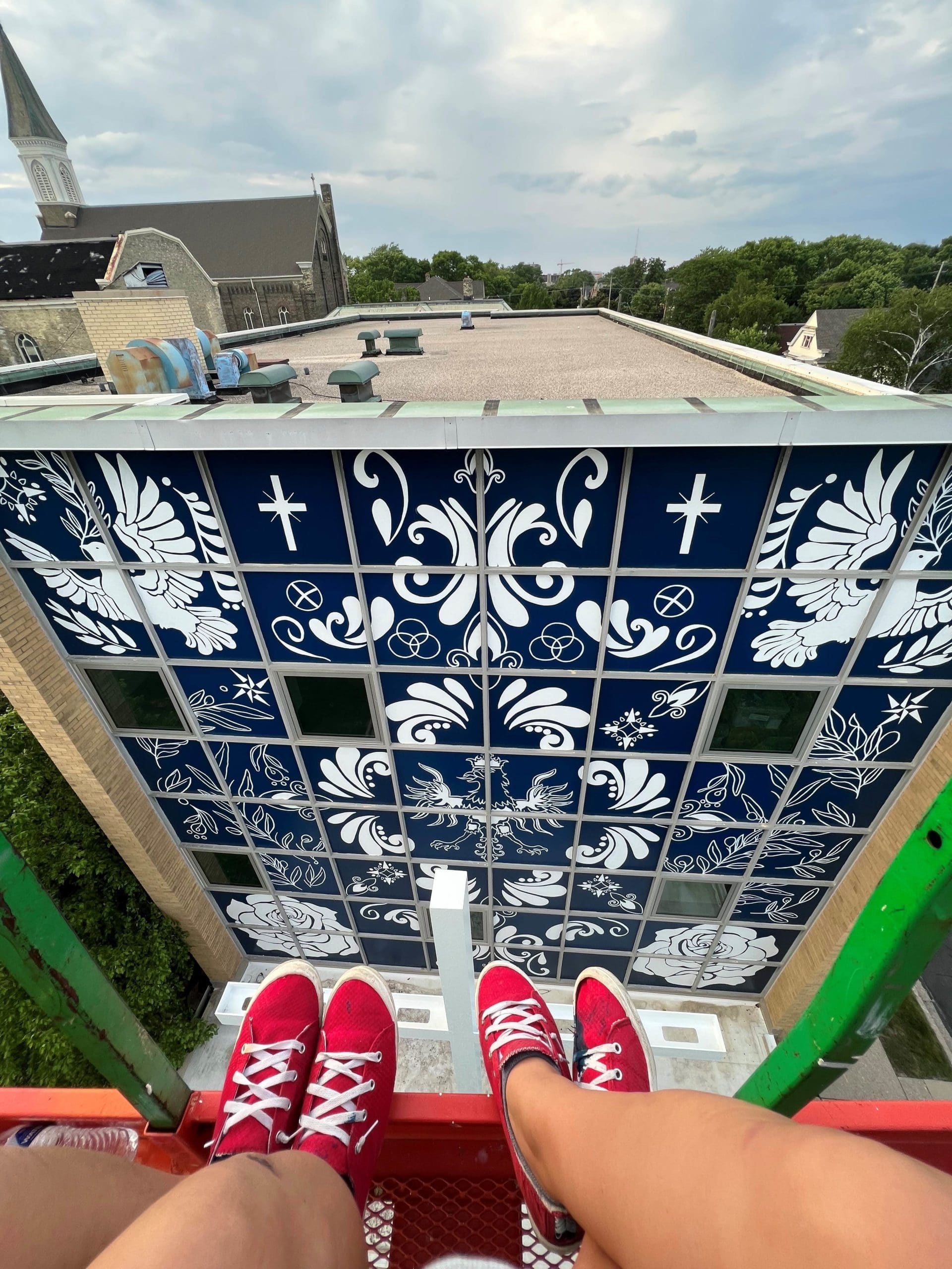 Two artists painted the mural: Arden (Instagram: @TheColorofArden) and Ayda Rose (Instagram: @AydaintheOffing), a muralist based out of Fayetteville, North Carolina. The vibrant blue and white mural located on the front-facing building on Murray Street is a celebration of community connecting the surrounding parishes of the Cathedral of St. John the Evangelist, Old St. Mary, Our Lady of Divine Providence, St. Casimir, Ss. Peter and Paul, and the Three Holy Women (St. Rita, St. Hedwig and Holy Rosary).
