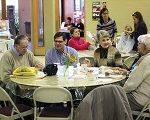 Don Filipiak, left to right, Jim Goddesne, Ingrid Filipiak, Joan Tarantino, (partially obscured) and John Tarantino dine on brunch using local foods at the Nov. 24 Markets & Meals for Hope market at Good Shepherd Church, Menomonee Falls. (Catholic Herald photo by Peter Fenelon)
