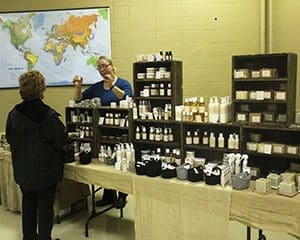 Petra Ahnert, owner of Beehive Alchemy, talks with a shopper at the Nov. 24 Markets & Meals for Hope market at Good Shepherd Church, Menomonee Falls. Ahnert sells honey, body products and candles made from bee products. (Catholic Herald photo by Peter Fenelon)