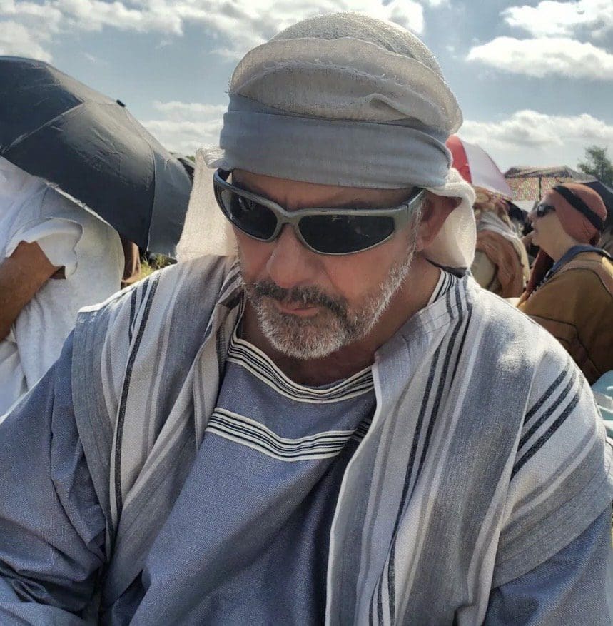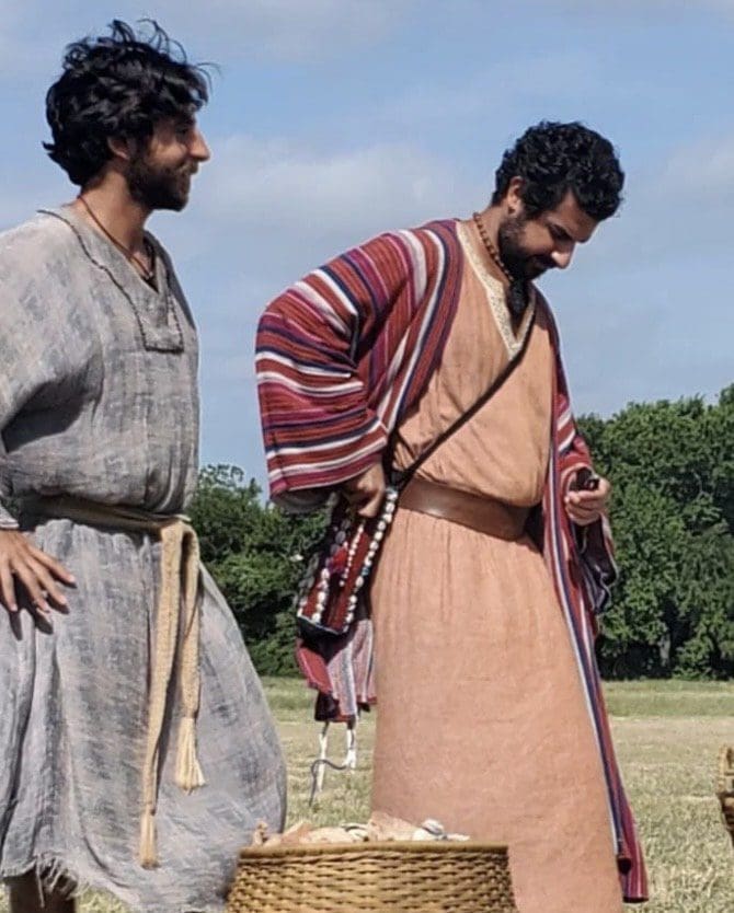 “I was much more excited to participate in the scenes of the feeding of 5,000, as the heat reminded my husband of his tours in Iraq. The wearing of what he called his ‘dress’ was a little weird for Joe. I chuckled a few times watching him try to cross his legs or sit in his tunic,” said Jeanine. “Having to wear a headdress was a little insufferable, to say the least, but the great news was we were able to have umbrellas and sunglasses right up to the point of filming and in between takes.”