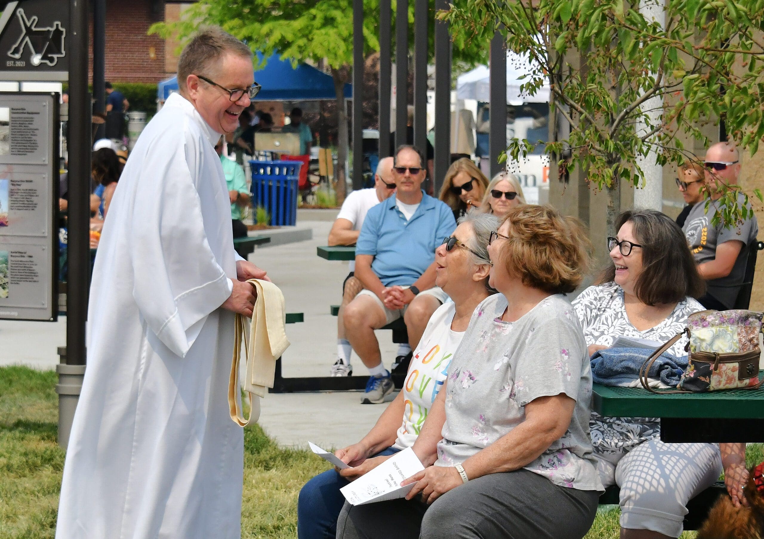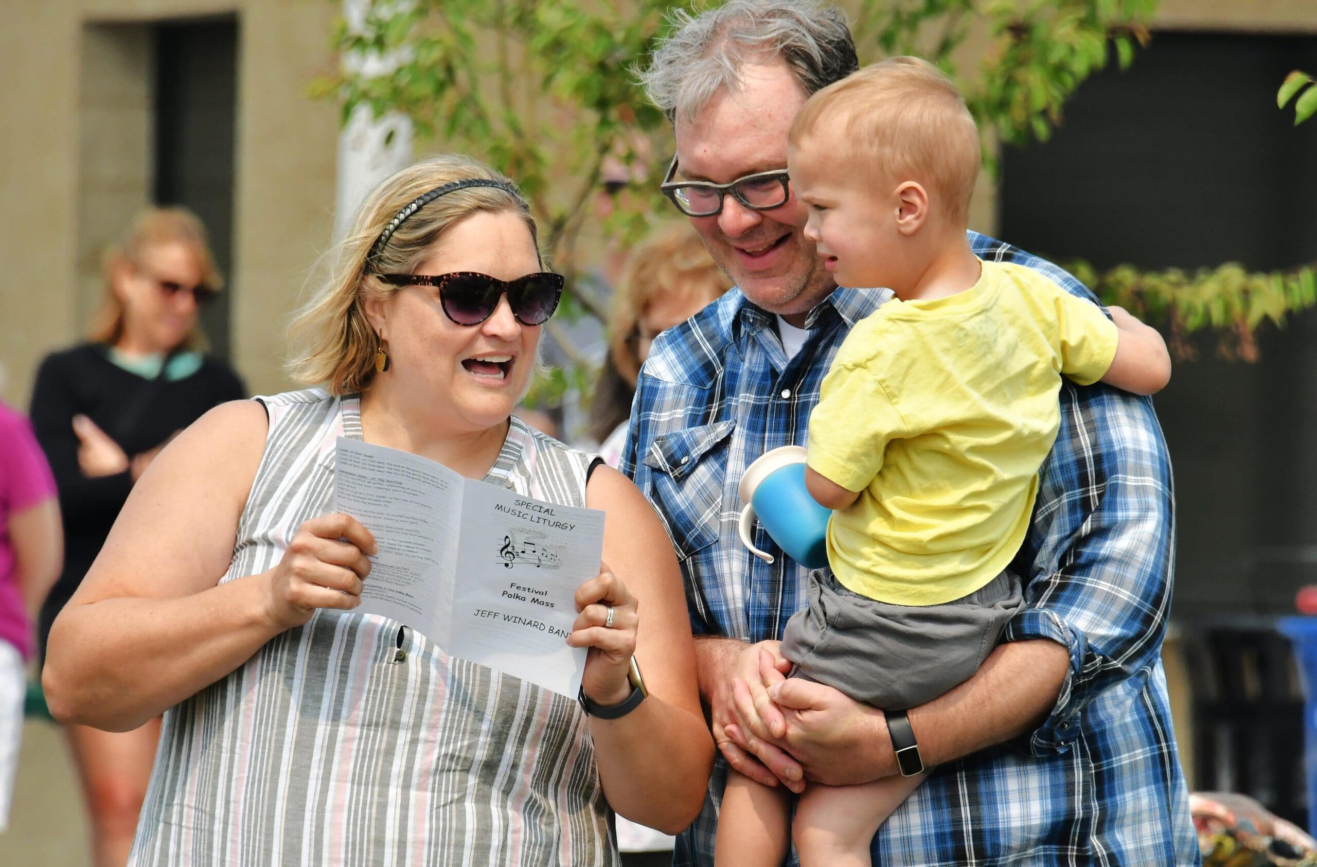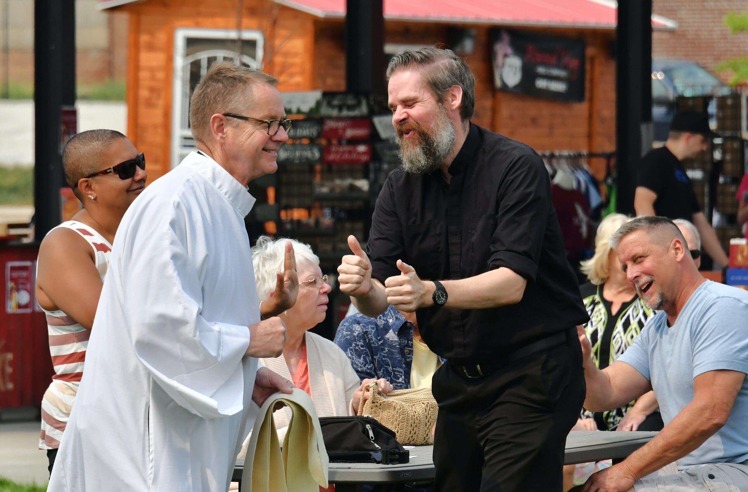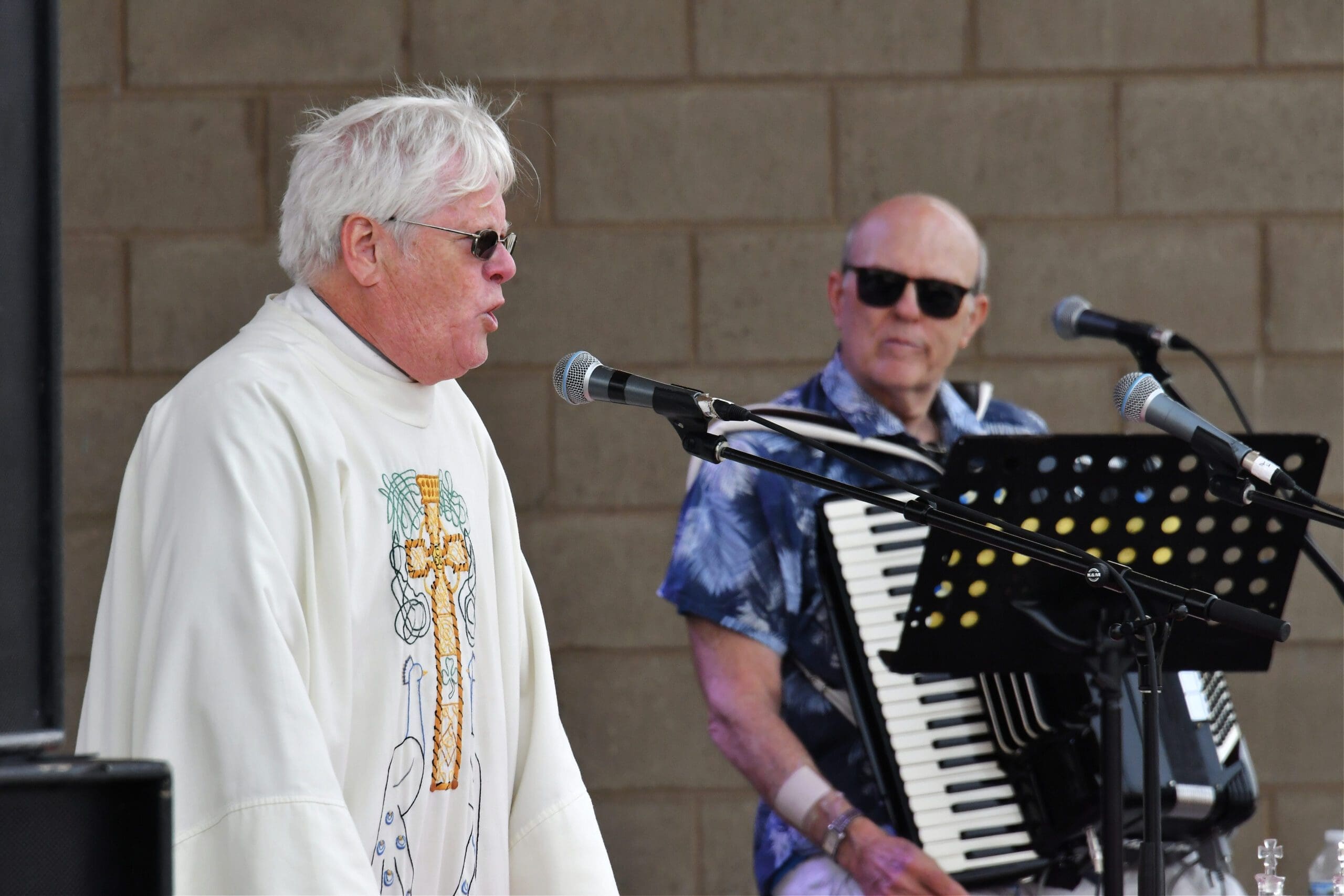 Fr. Tim Kitzke (left), shown with Fr. Christopher Klusman, celebrated a Polka Mass on Sunday, June 4, as part of Crusherfest in South Milwaukee. Crusherfest is an annual celebration in honor of legendary professional wrestler Reggie Lisowski, known to fans as Da Crusher. Lisowski, a devout Catholic, died in 2005. (Photos by David Bernacchi)