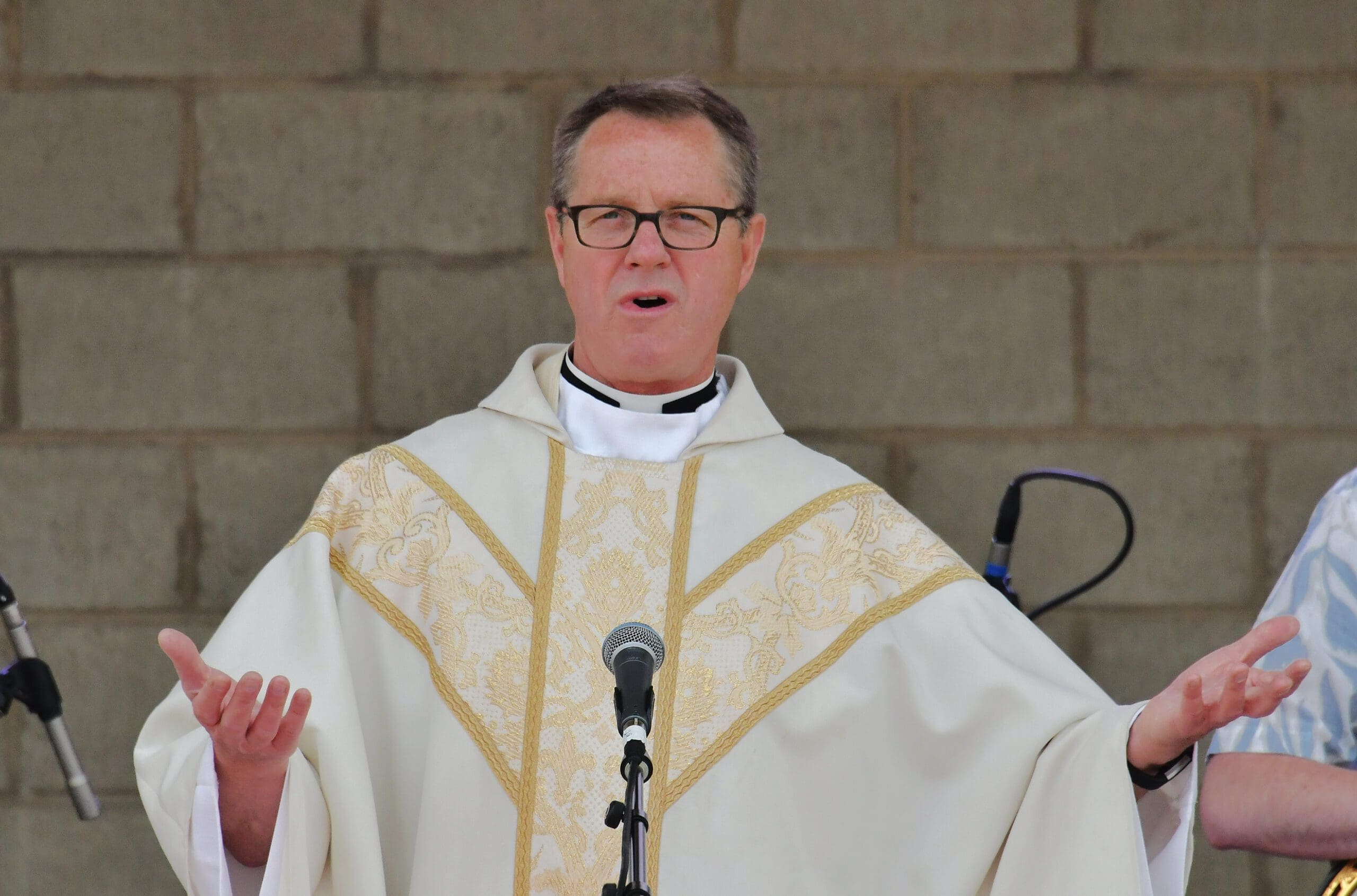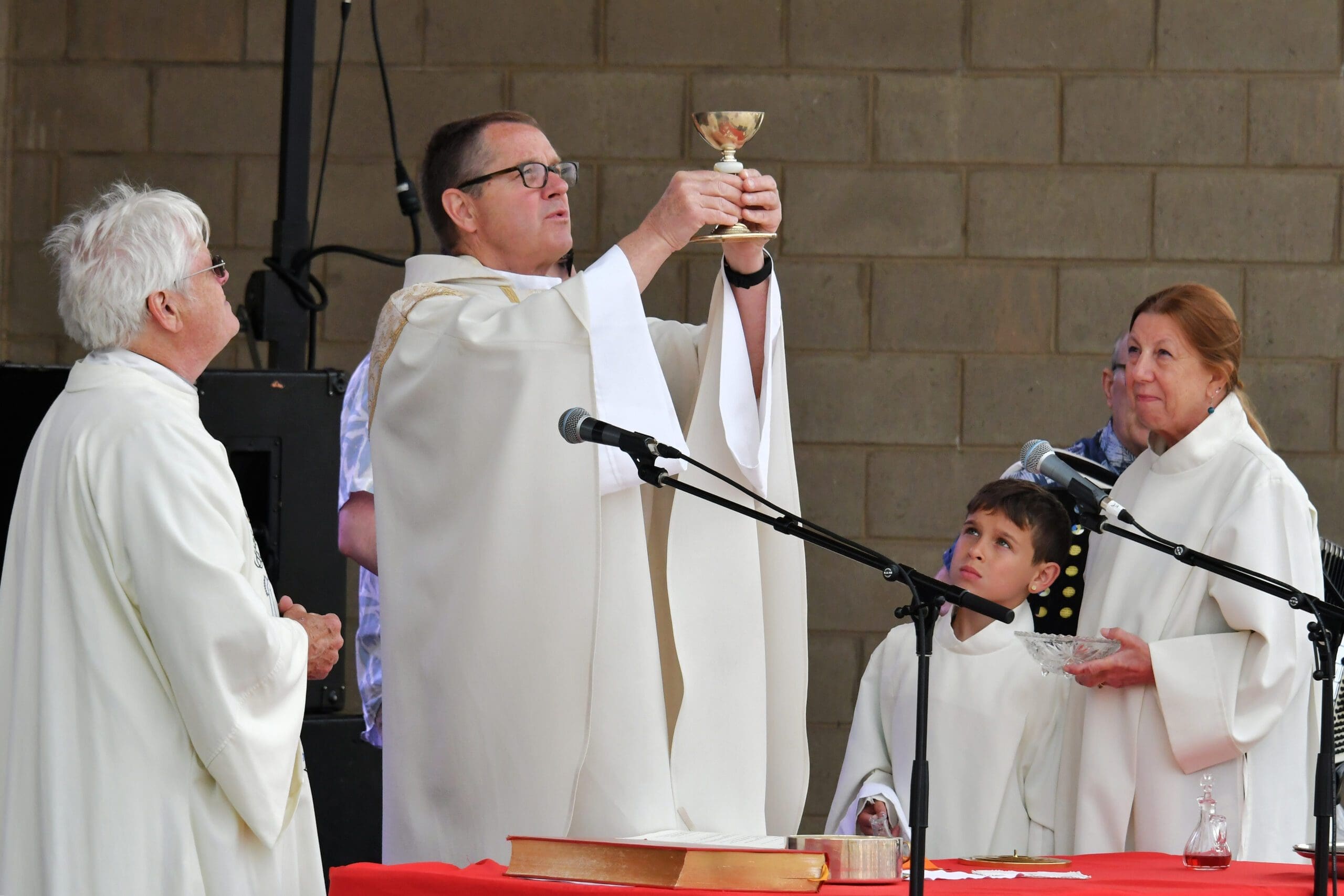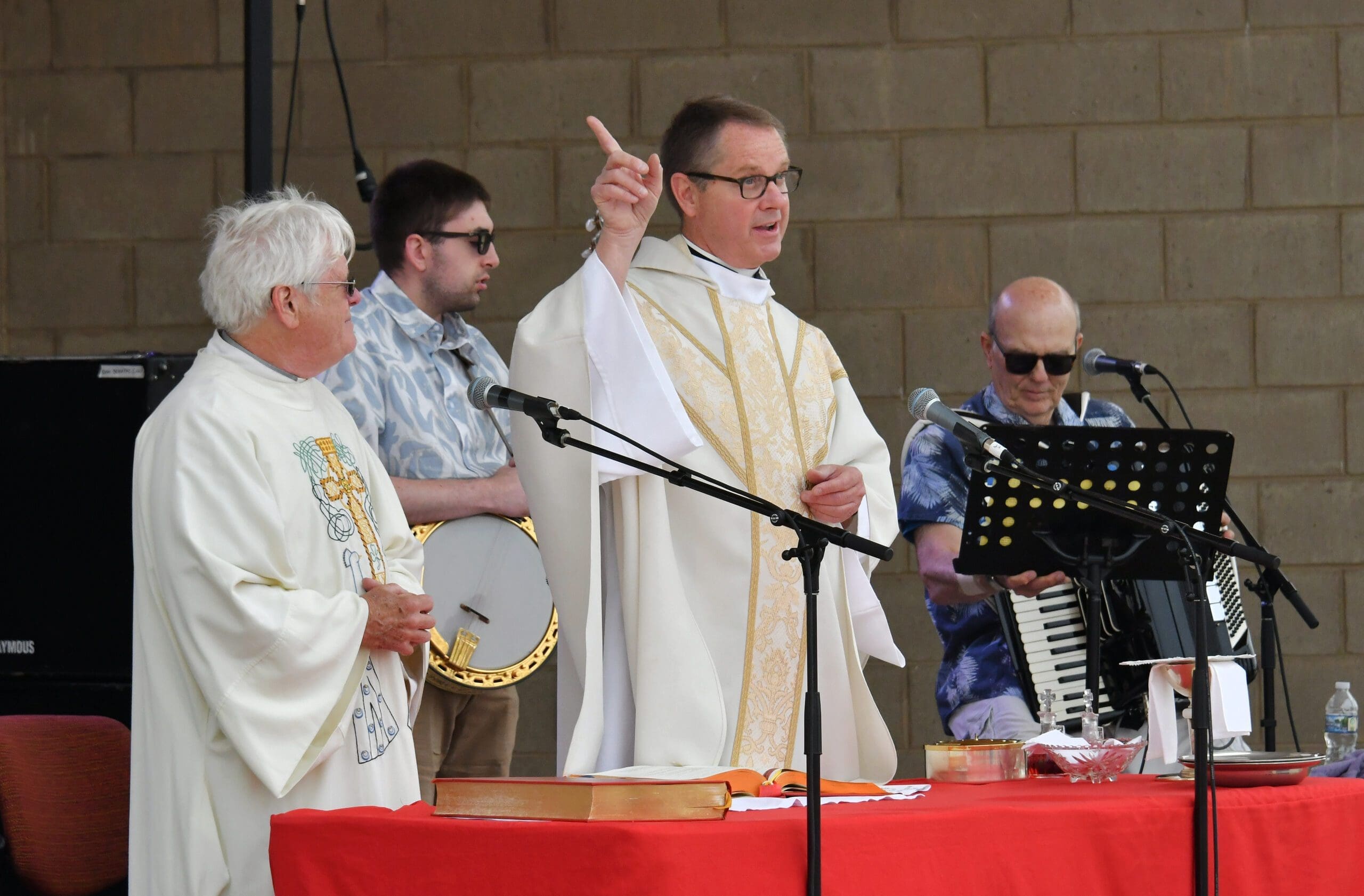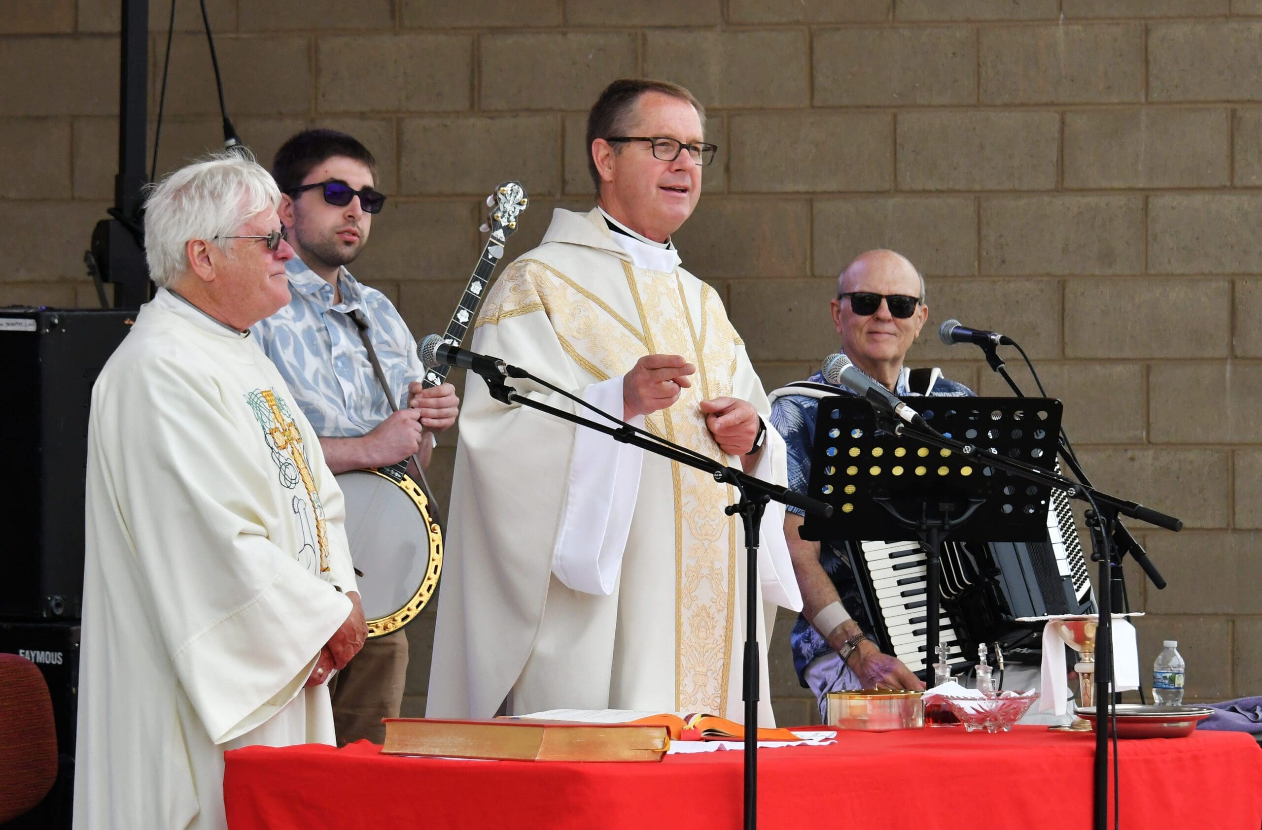 Fr. Tim Kitzke (left), shown with Fr. Christopher Klusman, celebrated a Polka Mass on Sunday, June 4, as part of Crusherfest in South Milwaukee. Crusherfest is an annual celebration in honor of legendary professional wrestler Reggie Lisowski, known to fans as Da Crusher. Lisowski, a devout Catholic, died in 2005. (Photos by David Bernacchi)