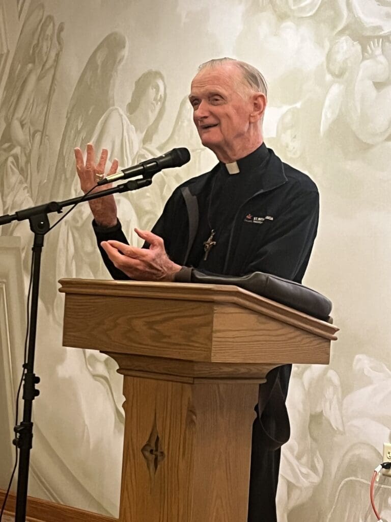 The Most Rev. Daniel Turley, Bishop Emeritus of the Diocese of Chulucanas in Peru, answers questions and shares insights about his friend and fellow Augustinian Pope Leo XIV at the Basilica of St. Josaphat, Milwaukee. (Photo by Colleen Jurkiewicz)