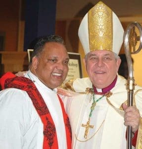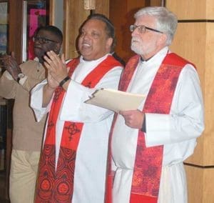 Redemptorist Fr. Maurice Nutt, director of the Institute for Black Catholic Studies at Xavier University in New Orleans, and Archbishop Jerome E. Listecki participate in the 26th annual memorial prayer service in honor of Rev. Dr. Martin Luther King, Jr. at All Saints Parish, Milwaukee, on Jan. 14. Fr. Nutt was the keynote speaker at the event. (Catholic Herald photos by Joe Poirier)