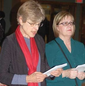 Two attendees sing along to music led by the Catholic Community Choir. More than 250 people were in attendance during the prayer service.