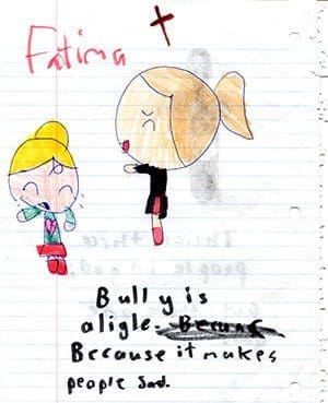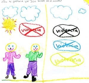 Children from St. Adalbert and St. Rafael the Archangel parishes, Milwaukee, were invited to participate in the parish synod session by drawing pictures of who God is and what God should do in the world. Above, Jennifer Marquez, when asked what she would want Jesus to do in the world, drew a photo eliminating violence, while below, Fatima Rios described bullying as “illegal.”