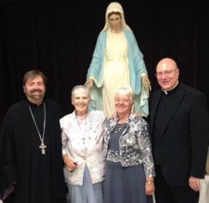 Fr. Rick Rohrer, who oversees Project Rachel in the Diocese of Raleigh, North Carolina, left to right, Pat Morris, Vicki Thorn and Fr. Ken Metz, pose for a photo at Project Rachel’s 30th anniversary celebration Sept. 19 at St. Margaret Mary Parish, Milwaukee. Thorn is founder and executive director of Project Rachel. (Submitted photo courtesy Vicki Thorn)