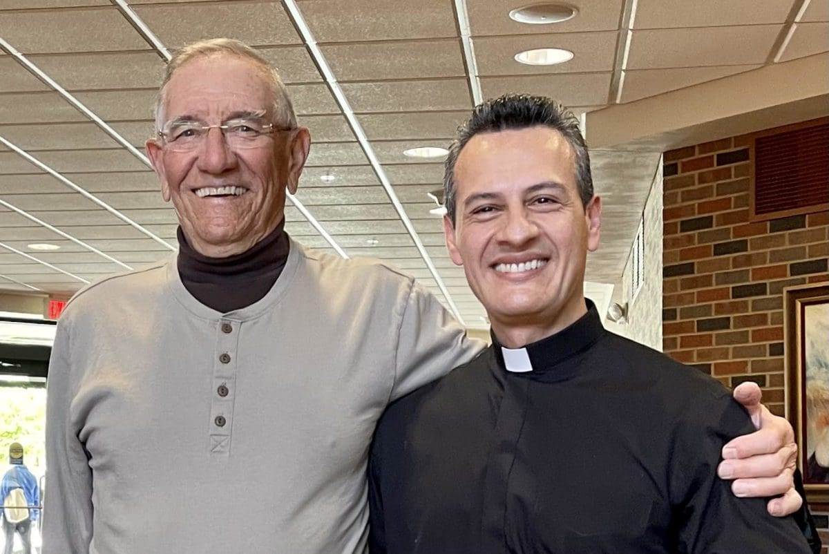 Adrian Schoone (left), shown with Fr. Yamid Blanco, recently made a donation of more than $200,000 to St. Paul the Apostle Catholic Church in Racine. (Submitted photo)
