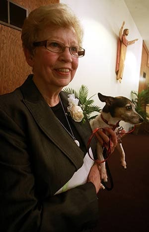 God called twice, according to Sr. Lorna Mary Colosimo, who recently professed vows with the Franciscan Sisters of St. Clare. She spent 25 years as a member of the Sisters of St. Francis in Millvale, Pa., shown at right, was married to Jimmy Colosimo for 21 years and is pictured , at left, with her dog, Annabella at the Franciscan Sisters of St. Clare’s Franklin headquarters. (Catholic Herald photo by Allen Fredrickson)