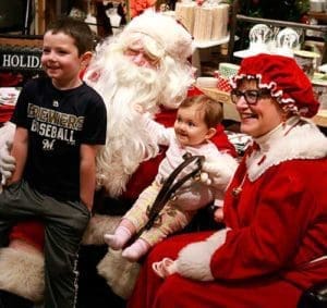 Santa and Mrs. Claus, sometimes known as Robert and Gloria Jean Siegel-Howe, visit with 6-year-old Reid Bibo and 6-month-old Mara Bibo at Sendik’s Food Market at the Hartbrook Mall in Hartland on Sunday, Dec. 4. They are the children of Mandy and Andy Bibo, members of St. James Parish, Menomonee Falls. (Catholic Herald photo by Allen Fredrickson)