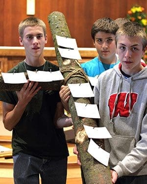 Michael Strandt, Brendan Sanchez and Ben Fenelon participate in a celebration at the Schoenstatt Center in Waukesha, Oct. 12 where Archbishop Jerome E. Listecki blessed a new hall.The Schoenstatt Movement began in Germany and was founded by Pallottine Fr. Joseph Kentenich. The priest was entrusted with spiritual direction at a minor seminary where he guided boys ages 13 to 19 and focused on character education.