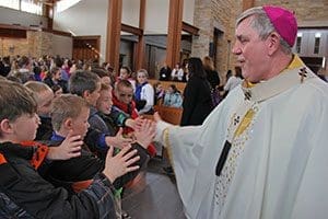 When Kenosha’s All Saints Catholic Elementary School opened its doors for the first time in fall 2011, enrollment was 454 students.School children from St. Mary’s Springs Academy in Fond du Lac reach out to shake the hand of Archbishop Jerome E. Listecki following a Catholic Schools Week Mass with the archbishop on Friday, Jan. 31 at Holy Family Church in Fond du Lac. The Mass included more than 900 students from Catholic schools in the Fond du Lac region. (Catholic Herald photo by Steve Wideman)