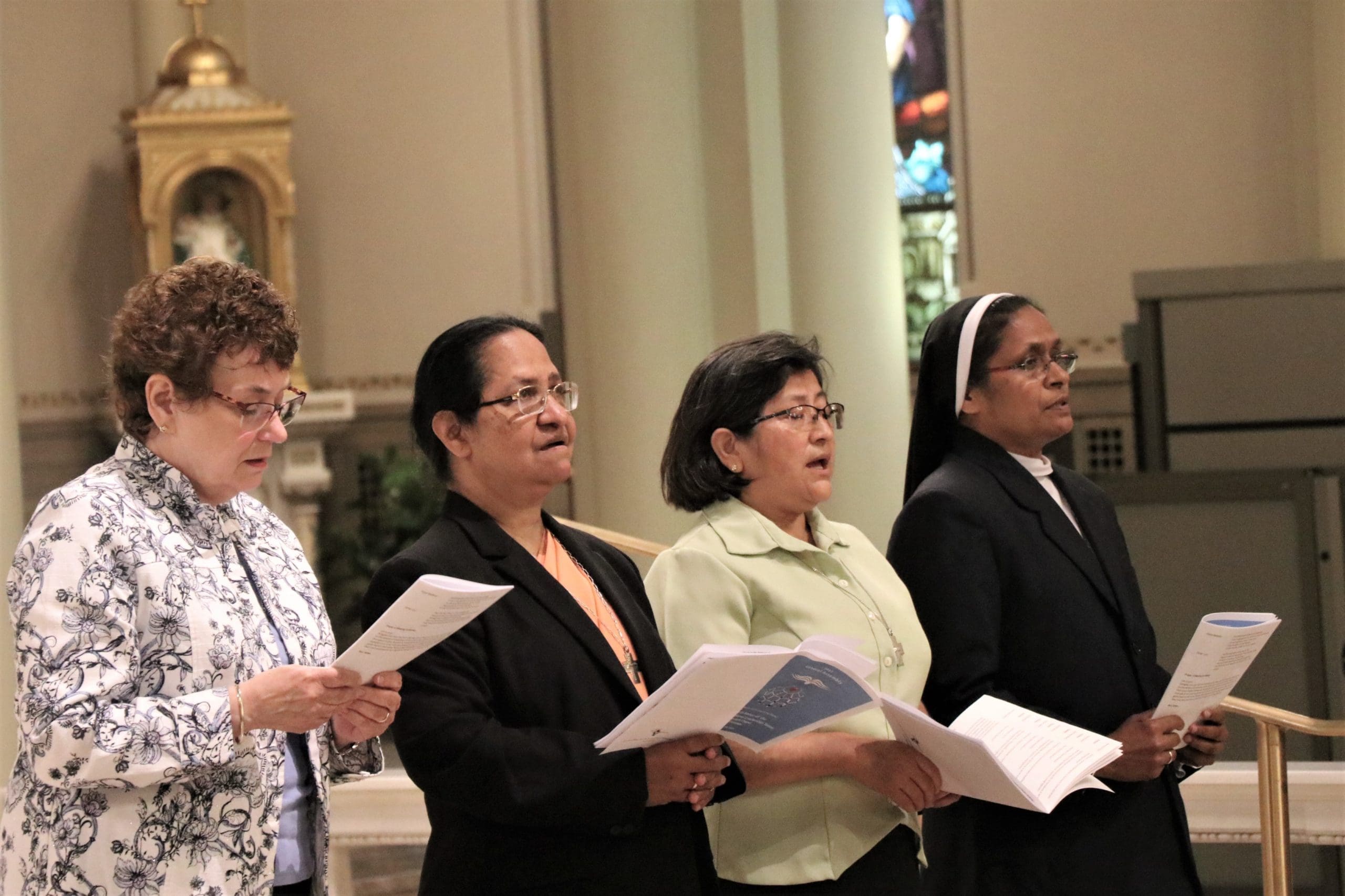 The School Sisters of St. Francis’ new International Leadership Team (from left, Sr. Deborah Fumagalli, Sr. Tresa Abraham Kizhakerparambil, Sr. Mathilde Maravi and Sr. Jincy Vilayappully) at a Mass in their honor July 10 at the St. Joseph Chapel at their motherhouse. (Submitted photo)