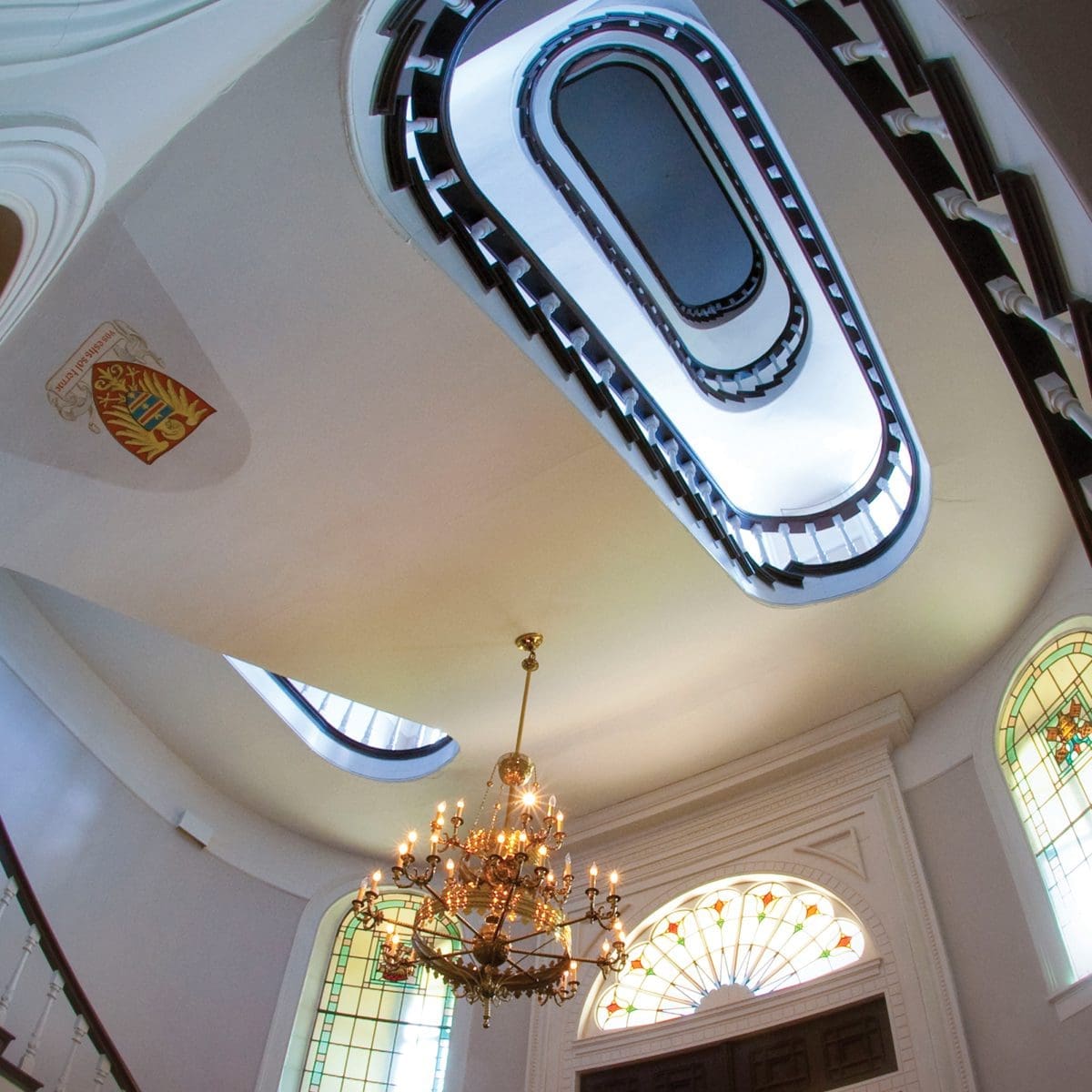 The hand-carved grand staircase, which winds up all five floors, is a wonder to behold.