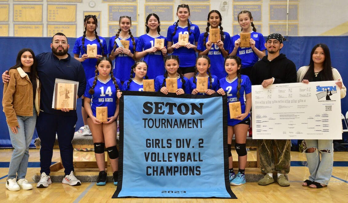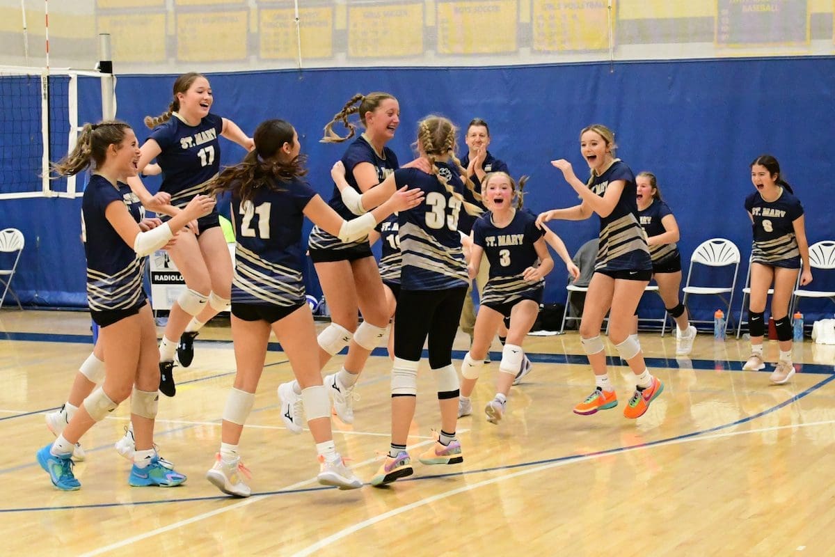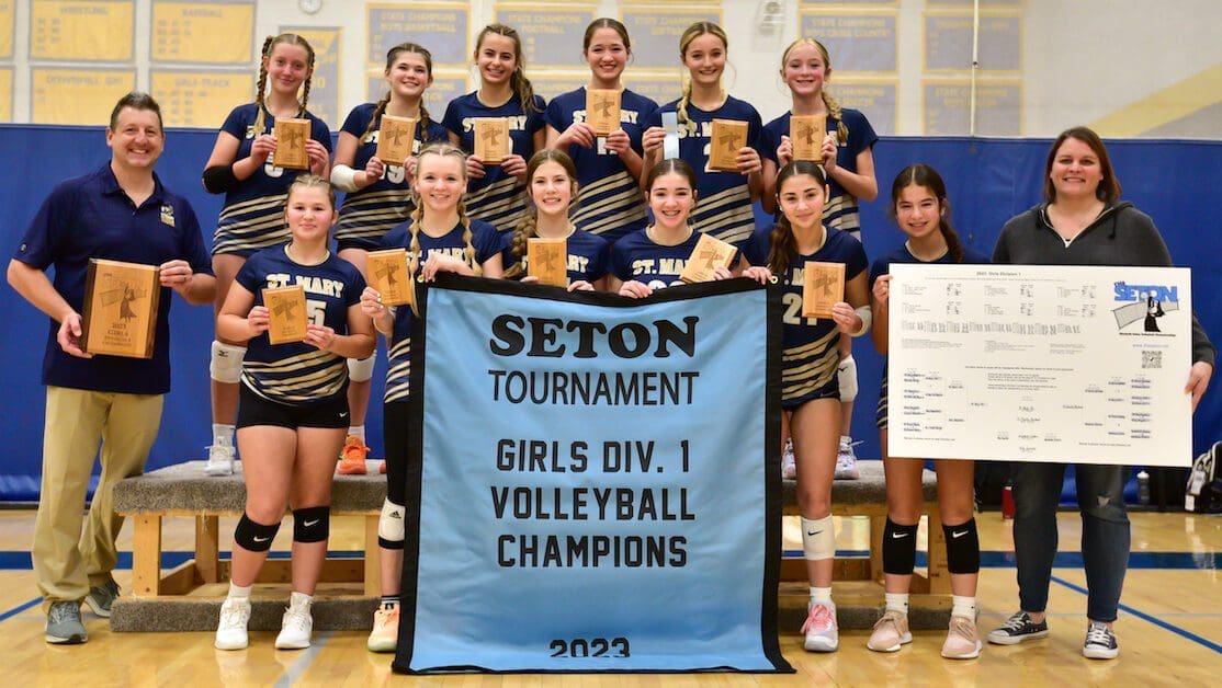 Players from St. Mary, Hales Corners, celebrate winning the girls Division 1 championship at the Seton Volleyball Tournament. (Photos Courtesy of Glen Barkow)