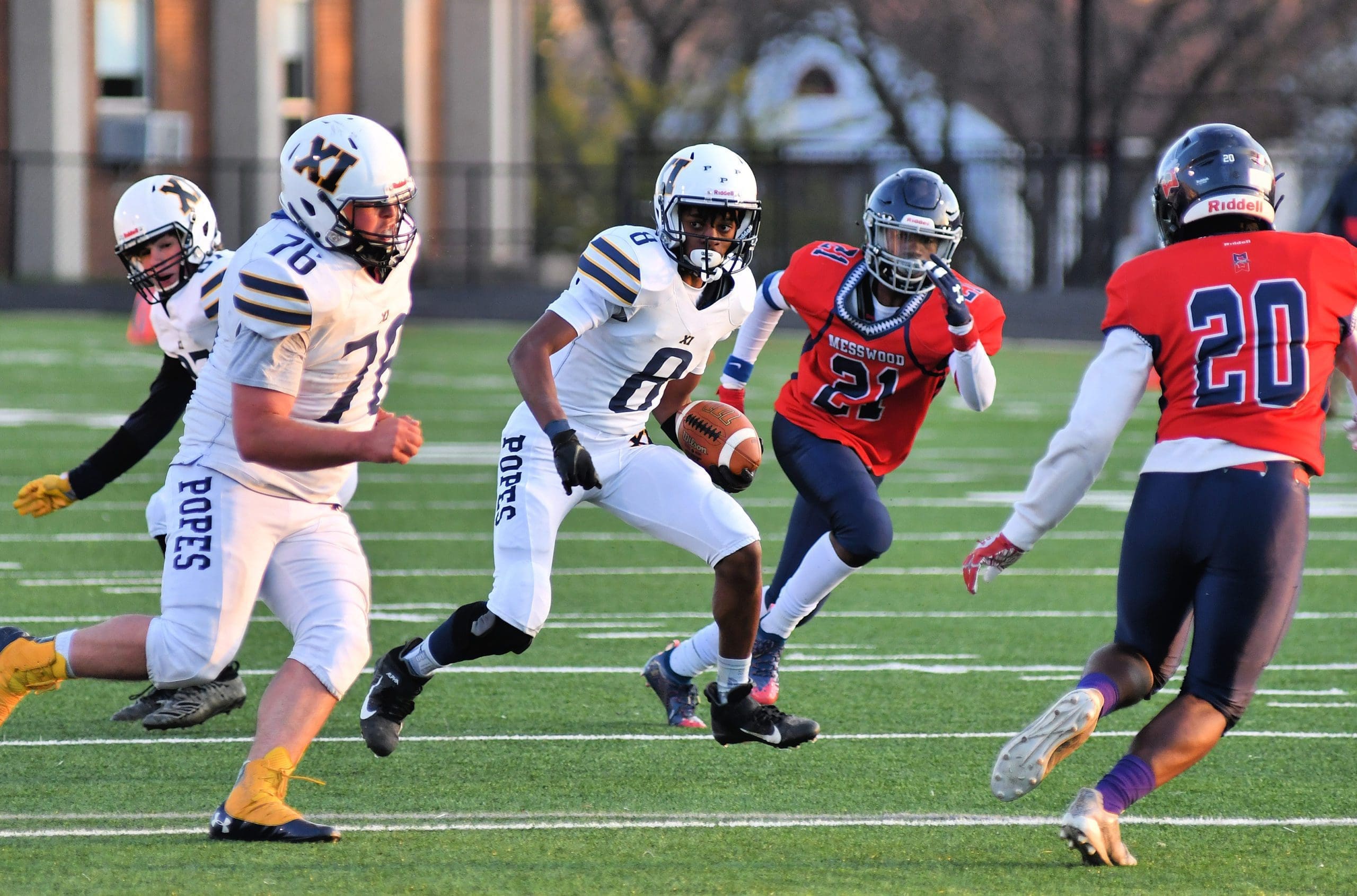 Pius XI’s Maurice Hughes (8) opened the scoring on Friday, April 16, by taking a short pass near the line of scrimmage and sprinting 23 yards on the Popes’ opening drive. Pius defeated Messwood, 42-8. (Photo by David Bernacchi)