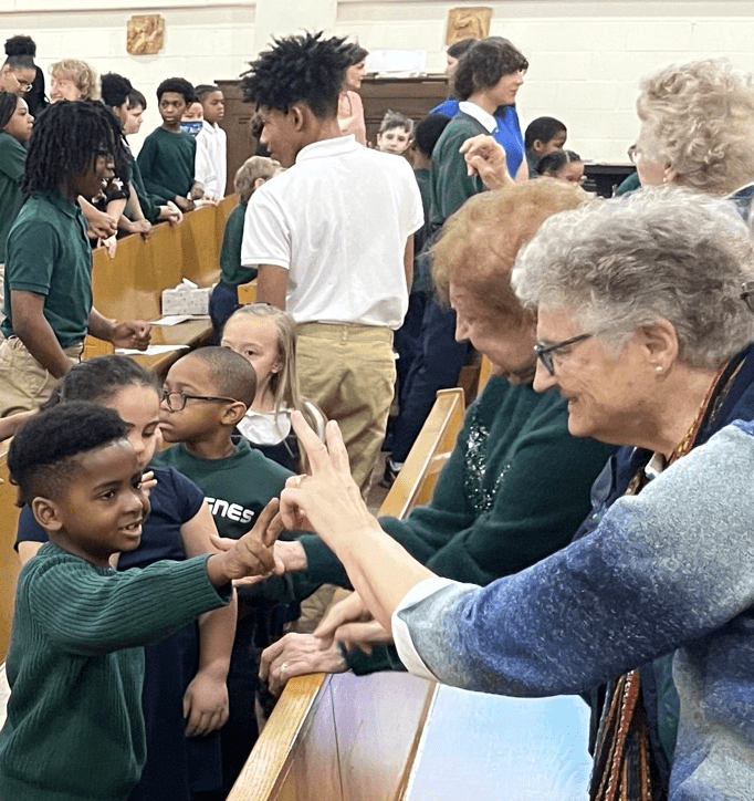 A St. Agnes student shares the Sign of Peace with a School Sister of Notre Dame during a Mass celebrating the school’s 100th anniversary. (Photos by Larry Hanson)