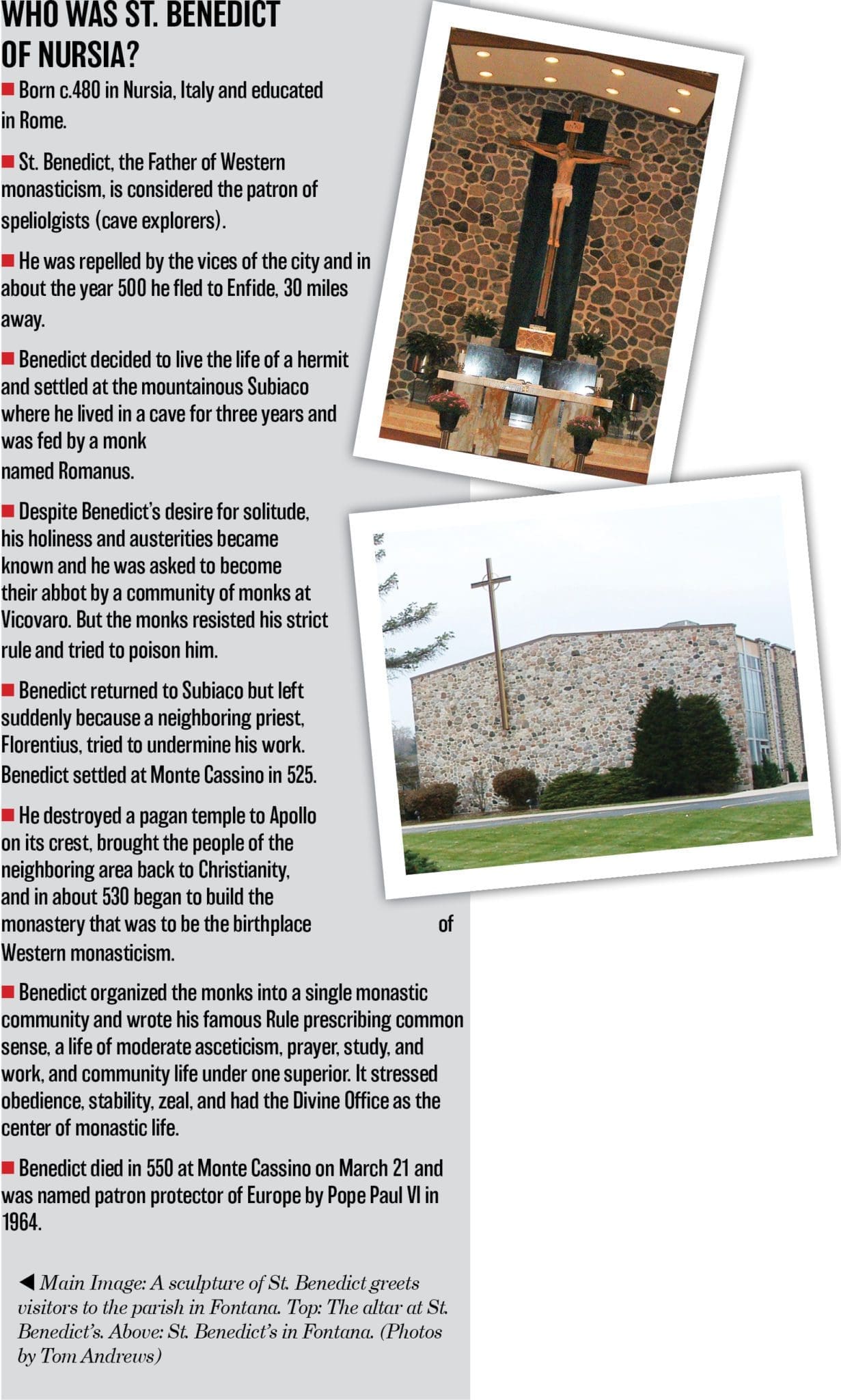 St. Benedict Parish in Fontana has been around a long, long time. In 2015, the church celebrated its 150th anniversary. Property for building a church on Third Street was purchased in 1915 and the deed was recorded at the courthouse ayear later.