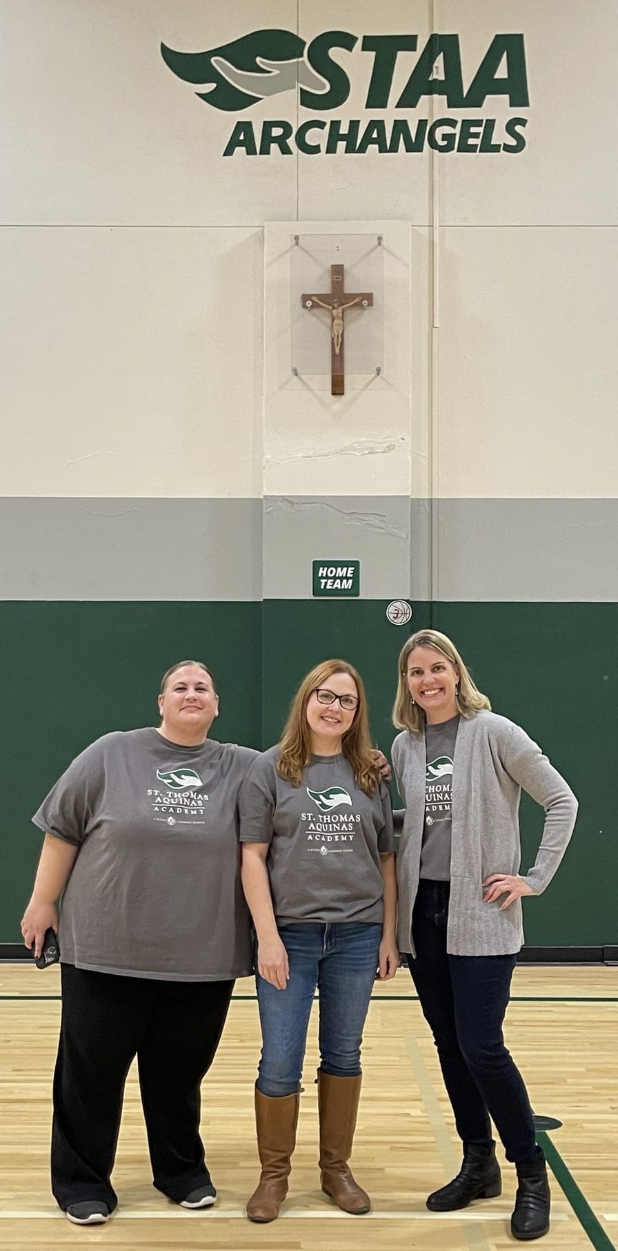 St. Thomas Aquinas Principal Andrea Bergmann (left), along with marketing committee members Sandy Copp and Jennifer Sanchez, displays the school’s new standard logo (on their shirts) and the new athletics logo (on the wall). (Photo by Larry Hanson)