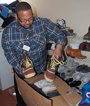 Pastor James W. West, Jr., executive director of Repairers of the Breach, sorts through donations given to the homeless shelter through Stan’s Fit for Your Feet “Share-A-Pair” shoe drive on Monday, Feb. 16. (Catholic Herald photo by Ricardo Torres)
