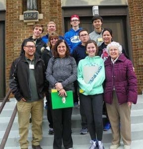 Confirmation students from St. Louis Parish, Caledonia, are pictured outside St. Ben’s Community Meal, the “third Station,” during their urban Stations of the Cross experience, Saturday, Jan. 21. Pictured are Arturo Carrillo, front row left to right, Ginger Rohde, Tori Lara and Urban Plunge coordinator, Sr. Jean Ellman; second row: Kim Kortendick, George Meyer, and St. Louis director of youth formation, Colleen Rooney; third row: Taylor Schneider, Lincoln Bargendes, Eric Sorenson and Alec Dam. (Catholic Herald photo by Rory Gillespie)