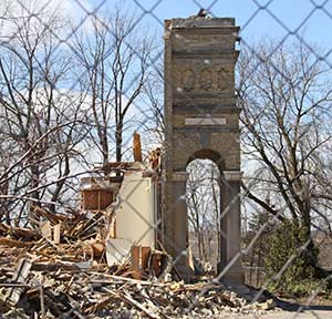 A hollowed out structure is all that remains of the St. Joseph Hall, leveled by fire on March 8. (Catholic Herald photo by Steve Wideman)from classrooms and offices for cleaning. Virtually every indoor surface of the building was repainted or varnished to remove most of the smoke odor before classes resumed.