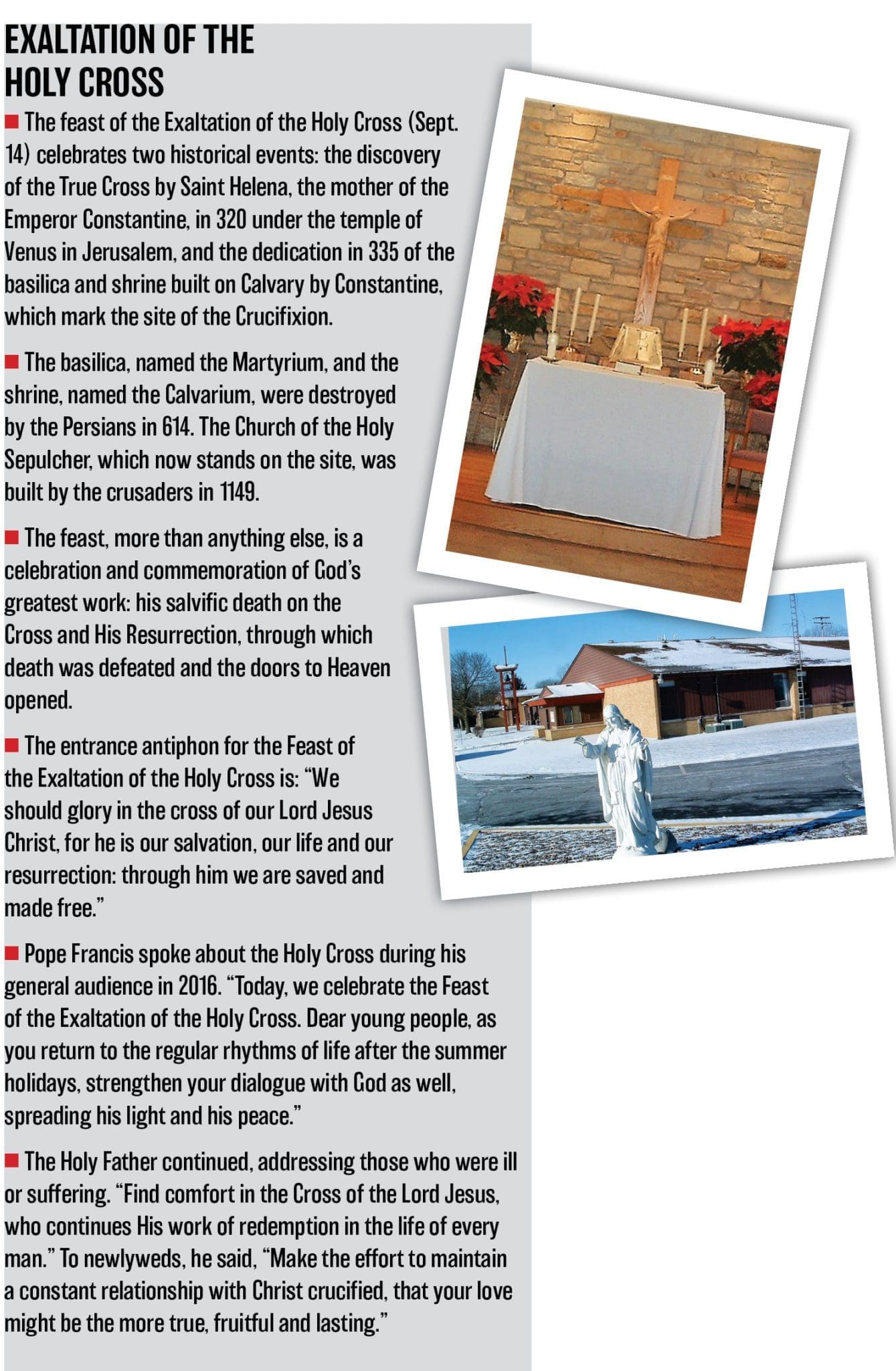 On Jan. 1, 2009, St. Scholastica and Holy Name of Jesus were again reunited — this time permanently, as one parish with two locations, proclaiming, “To help with the decline in the number of parish priests, we were formally merged with those whom we shared so much early history. We were renamed once again, this time to Holy Cross Parish.”