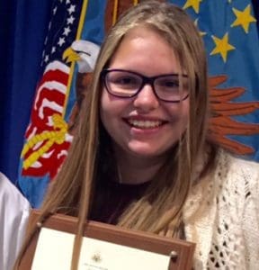 Jessica Ullberg, 16, a member of St. Peter Parish, East Troy, displays the award she received from the Milwaukee Veteran Affairs Medical Center, Jan. 19, for her hundreds of hours of service to the VA’s Adult Day Health Care veterans. (Submitted photo courtesy Annette Ullberg)